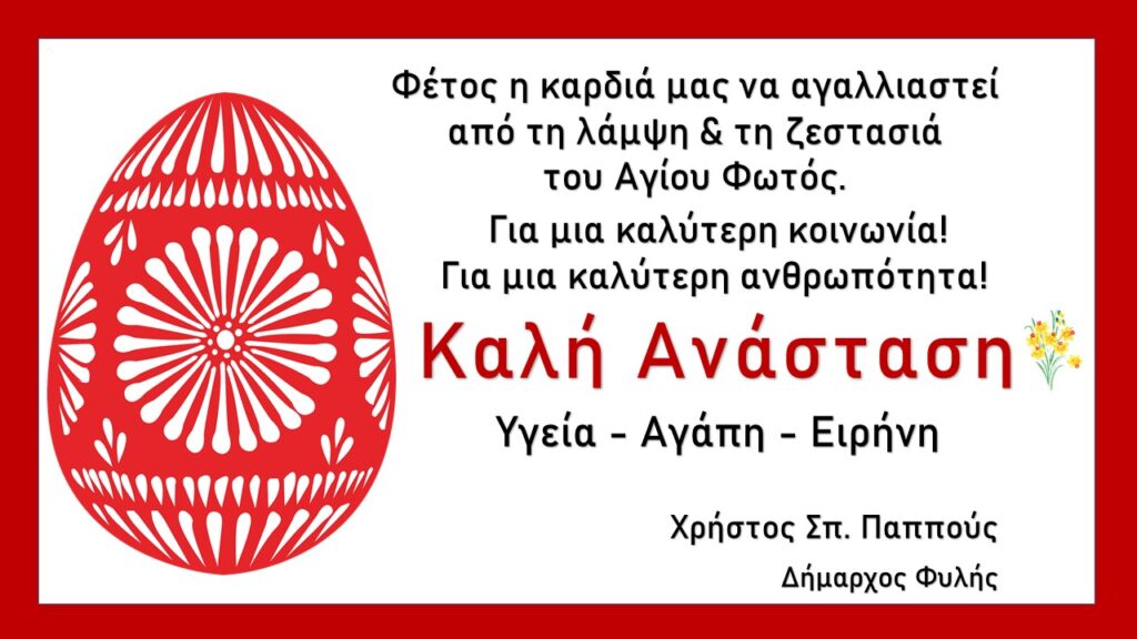 ΑΡΘΡΟΓΡΑΦΙΑ Πασχαλινές ευχές του Δημάρχου Φυλής Χρήστου Παππού Ημερομηνία: 1 Μαΐου 2024 Κοινοποιήση: FacebookPinterestWhatsApp Προηγούμενο άρθροΣχέδια για τη διαχείριση και την ποιότητα του πόσιμου νερού συντάσσει ο Δήμος ΦυλήςΕπόμενο άρθροΕυχές για καλό Πάσχα από τον ειδικό συνεργάτη του Δημάρχου Φυλής Γιάννη Λιάκο Τραγωδία στη λεωφόρο ΝΑΤΟ – Οδηγός μηχανής έχασε τη ζωή του σε δυστύχημα 16 Απριλίου 2026 Στα Άνω Λιόσια χτυπά η καρδιά του kick boxing ΔΗΜΟΣ ΦΥΛΗΣ Τέσσερις τελευταίες «Καραμέλες Ούζου» στο Από Μηχανής Θέατρο ΠΟΛΙΤΙΣΜΟΣ Ολοκλήρωση σύνταξης Επιχειρησιακού Σχεδίου για την εξασφάλιση κοινοχρήστων και κοινωφελών χώρων στον Δήμο Φυλής ΑΥΤΟΔΙΟΙΚΗΣΗ Νεφελώδης καιρός με μικρή πιθανότητα για ασθενείς τοπικές βροχές αύριο Κυριακή του Πάσχα – Πρόγνωση καιρού Άνω Λιοσίων, Φυλής & ν.Αττικής ΚΑΙΡΟΣ Καλό Πάσχα, χρόνια πολλά! – Cityface.gr ΠΟΛΙΤΙΣΜΟΣ παρομοια αρθρα ΑΡΘΡΟΓΡΑΦΙΑ Ευχές για το Πάσχα από τον αντιδήμαρχο Θανάση Σχίζα ΑΡΘΡΟΓΡΑΦΙΑ Μήνυμα για την Ανάσταση από τον Δήμαρχο Χρήστο Παππού ΑΡΘΡΟΓΡΑΦΙΑ Ευχές για το Πάσχα από τον Δημοτικό Σύμβουλο Μηνά Ζέρβα ΑΡΘΡΟΓΡΑΦΙΑ Ευχές για την Ανάσταση από την αντιδήμαρχο Φυλής Ελένη Λιάκου