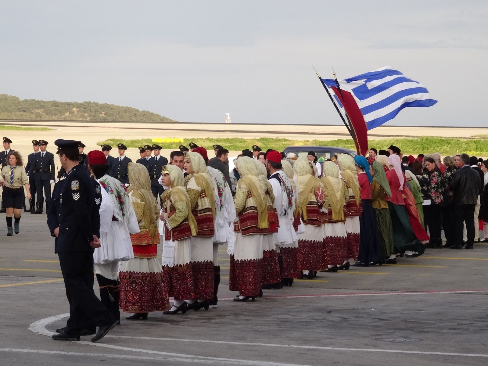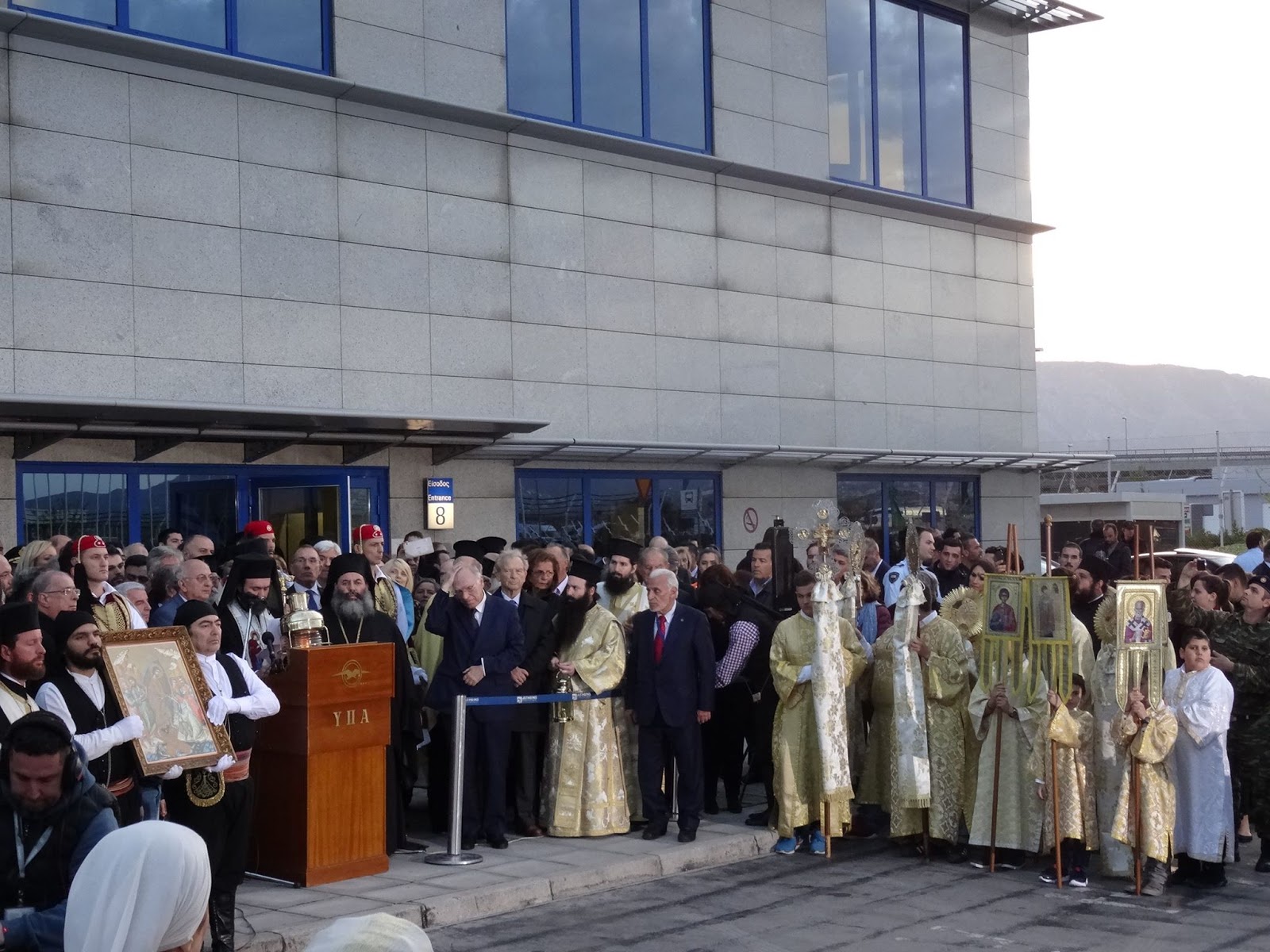 Ο Έξαρχος του Πανάγιου Τάφου αρχιμανδρίτης Δαμιανός κατήλθε του αεροσκάφους με τον ειδικό φανό ανά χείρας, ενώ η Φιλαρμονική του Στρατού ανέκρουε τον Εθνικό Ύμνο.