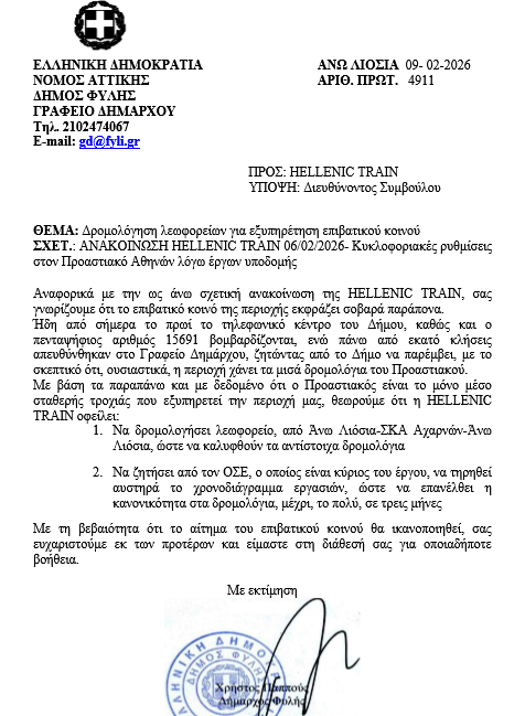 Την άμεση αντίδραση του Δημάρχου Φυλής Χρήστου Παππού προκάλεσε η ανακοίνωση της HELLENIC TRAIN, με την οποία γνωστοποιεί στο επιβατικό κοινό της περιοχής ότι η εταιρία καταργεί, από την Τρίτη 10-02-2026 και μέχρι νεωτέρας, τα μισά ημερήσια δρομολόγια της γραμμής ΑΝΩ ΛΙΟΣΙΑ-ΑΕΡΟΔΡΟΜΙΟ.