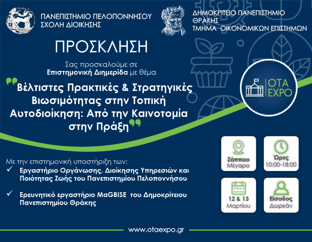Η Σχολή Διοίκησης του Πανεπιστημίου συμβάλλοντας στην επίτευξη των παραπάνω στρατηγικών στόχων, παρέχει την επιστημονική της υποστήριξη στην Έκθεση Τοπικής Αυτοδιοίκησης OTA EXPO 2025, της οποίας η σύγχρονη θεματολογία καλύπτει τον πυρήνα της αναπτυξιακής διαδικασίας τόσο σε τοπικό και περιφερειακό όσο και σε εθνικό επίπεδο.