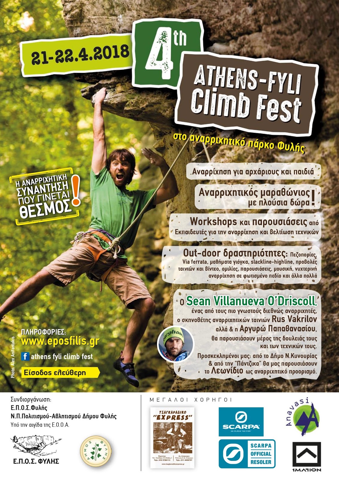 ΔΕΛΤΙΟ ΤΥΠΟΥ – Ο Αθλητικός και Πολιτιστικός Οργανισμός του Δήμου Φυλής (ΝΠΔΔ ΠΑΡΝΗΘΑ) και το αθλητικό σωματείο ΕΠΟΣ ΦΥΛΗΣ διοργανώνουν, για 4η συνεχόμενη χρονιά, το Φεστιβάλ Αναρρίχησης, στην είσοδο της Φυλής (Πλάτωσι), το Σαββατοκύριακο 21 και 22 Απριλίου 2018.