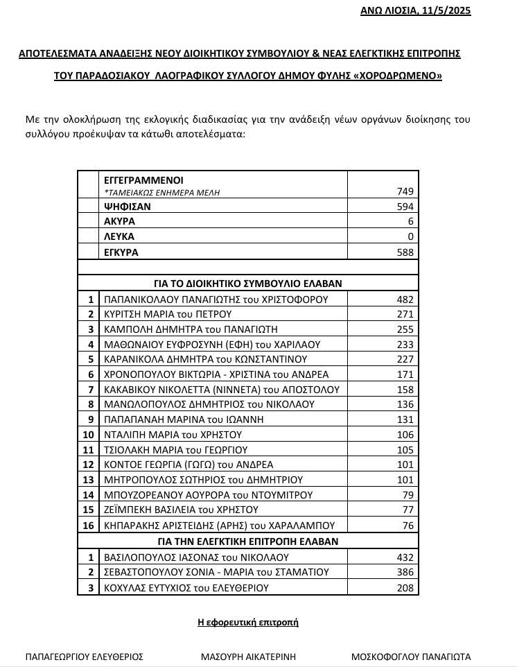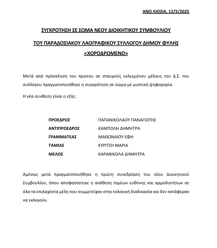 Σε σώμα συγκροτήθηκε ο Παραδοσιακός Λαογραφικός Σύλλογος Δήμου Φυλής “Χοροδρώμενο”, μετά τις εκλογές που πραγματοποιήθηκαν την Κυριακή 11 Μαΐου.