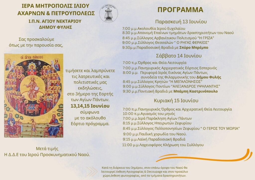 με εκκλησιαστικό πρόγραμμα και περιφορά ιεράς εικόνος,με κλείσιμο της χρονιάς και εκθέσεις των δραστηριοτήτων μας,με μουσικά δρώμενα και ορχήστρες,με Συλλόγους και χορευτικά,με κέφι και φαγοπότι,με λαχειοφόρο κλήρωση……