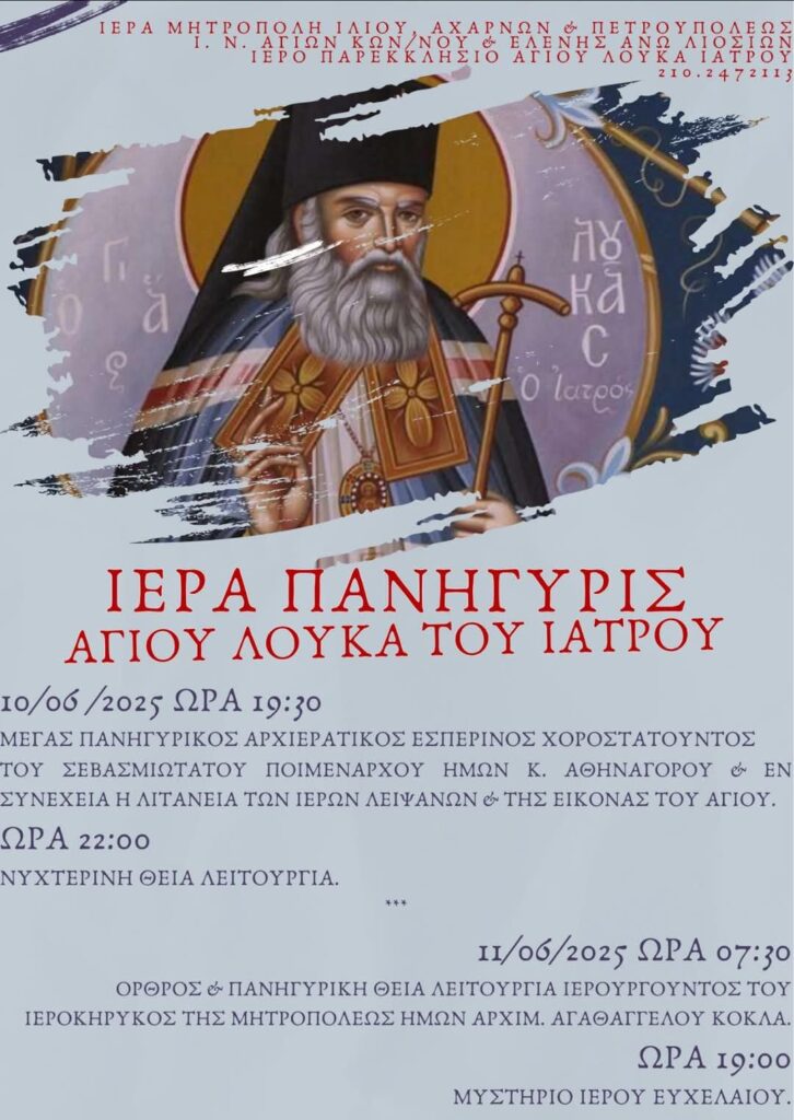 ΕΚΚΛΗΣΙΑ Σήμερα Τρίτη και αύριο Τετάρτη 11/6 η Ιερά Πανήγυρις του Αγίου Λουκά του Ιατρού Άνω Λιοσίων Ημερομηνία: 10 Ιουνίου 2025 Κοινοποιήση: FacebookPinterestWhatsApp Προηγούμενο άρθροTην Παρασκευή 13/6 η εκδήλωση “ΜΕΛΕΤΕΙΑ 2025”Επόμενο άρθροΤην Κυριακή 15/6 στο “Βορεινό” μουσική βραδιά για τα παιδιά από τον Σύλλογο Ζωφριάς Νεφελώδης καιρός με μικρή πιθανότητα για ασθενείς τοπικές βροχές αύριο Κυριακή του Πάσχα – Πρόγνωση καιρού Άνω Λιοσίων, Φυλής & ν.Αττικής 11 Απριλίου 2026 Καλό Πάσχα, χρόνια πολλά! – Cityface.gr ΠΟΛΙΤΙΣΜΟΣ Ισχυρό επενδυτικό ενδιαφέρον για την ανέγερση φοιτητικών εστιών 1.100 κλινών στο Πανεπιστήμιο Δυτικής Αττικής, μέσω ΣΔΙΤ ΚΟΙΝΩΝΙΑ Πλήθος πιστών στην Περιφορά του Επιταφίου των Αγίων Κων/νου και Ελένης στα Άνω Λιόσια ΕΚΚΛΗΣΙΑ Επιχείρηση της ΕΛ.ΑΣ. στα Άνω Λιόσια – Διακινούσαν κοκαΐνη δίπλα σε σχολείο ΕΓΚΛΗΜΑΤΙΚΟΤΗΤΑ Hellenic Train: Επανέναρξη δρομολογίων του Προαστιακού στο τμήμα Aνω Λιόσια – Αεροδρόμιο ΚΑΘΗΜΕΡΙΝΟΤΗΤΑ παρομοια αρθρα ΕΚΚΛΗΣΙΑ Πλήθος πιστών στην Περιφορά του Επιταφίου των Αγίων Κων/νου και Ελένης στα Άνω Λιόσια Σε κλίμα κατάνυξης κορυφώθηκε χθες, Μ. Παρασκευή 10 Απριλίου, το Θείο Δράμα, με εκατοντάδες πιστούς να συμμετέχουν στην... ΕΚΚΛΗΣΙΑ Το Σάββατο 04/04 (11:00) η λιτάνευση της Εικόνας της Ι.Μ. Κλειστών προς τη Φυλή ΕΚΚΛΗΣΙΑ Το Σάββατο 28/3 η λιτάνευση της Εικόνας από τη Μονή Κλειστών προς τα Άνω Λιόσια – Δείτε το πλήρες πρόγραμμα ΕΚΚΛΗΣΙΑ Με λαμπρότητα εορτάστηκε η Κυριακή της Ορθοδοξίας στα Άνω Λιόσια Στον εορτασμό της Κυριακής της Ορθοδοξίας, την 1η Μαρτίου 2026, στον Μητροπολιτικό Ιερό Ναό Αγίων Κωνσταντίνου και Ελένης...