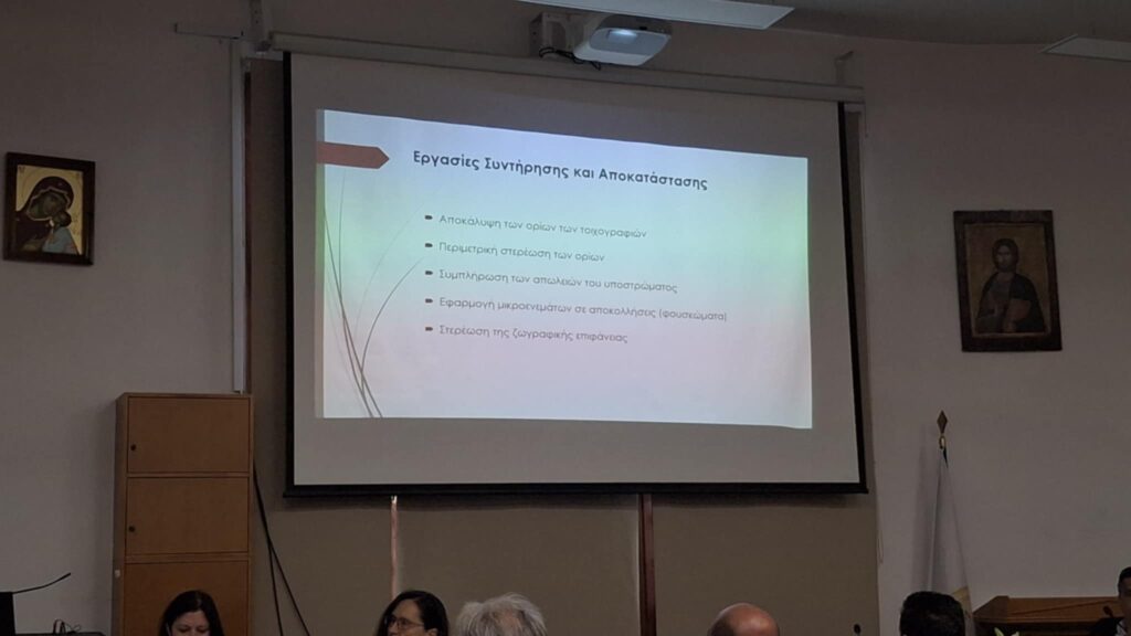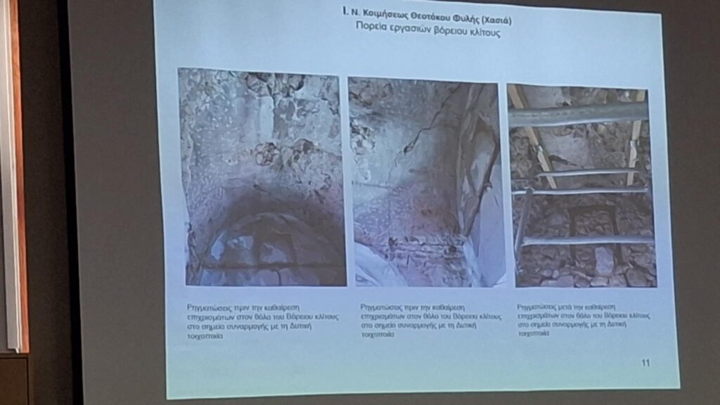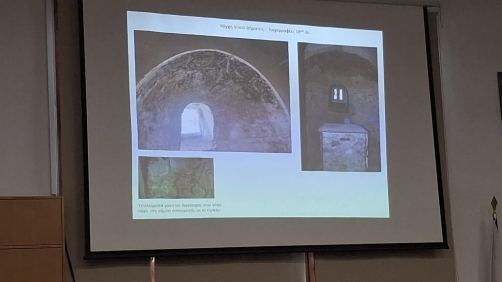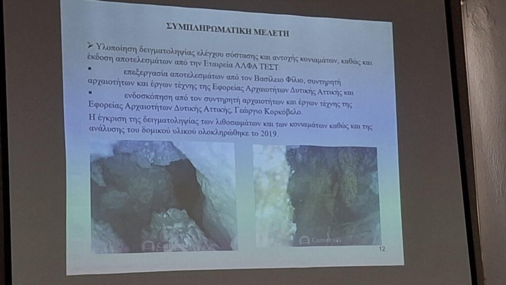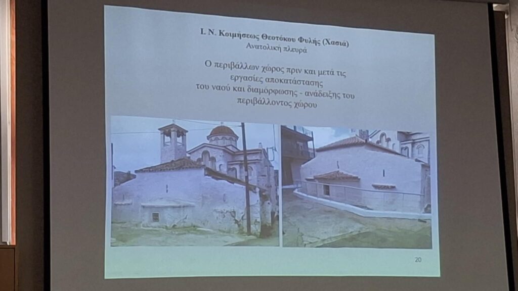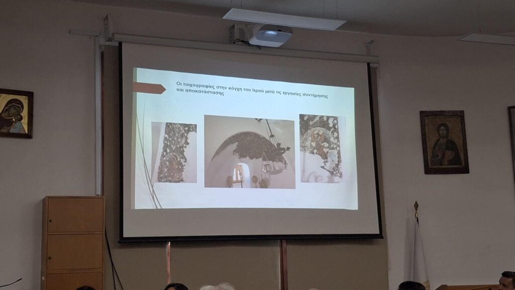 Η συντήρηση και αποκατάσταση του Ιερού Ναού ήταν ένα δύσκολο και απαιτητικό έργο, όπως τόνισαν στις σχετικές ομιλίες τους τόσο η Διευθύντρια Εφορείας Αρχαιοτήτων Δυτικής Αττικής Χριστίνα Μερκούρη, όσο και η Προϊσταμένη Τμήματος Βυζαντινών & Μεταβυζαντινών Αρχαιοτήτων και Μουσείων της Εφορείας Αρχαιοτήτων Δυτικής Αττικής Καλλιόπη Φλώρου, αλλά και η Συντηρήτρια Έργων Τέχνης και Αρχαιοτήτων της Εφορείας Αρχαιοτήτων Δυτικής Αττικής Στυλιανή Ζαμπλάρα.