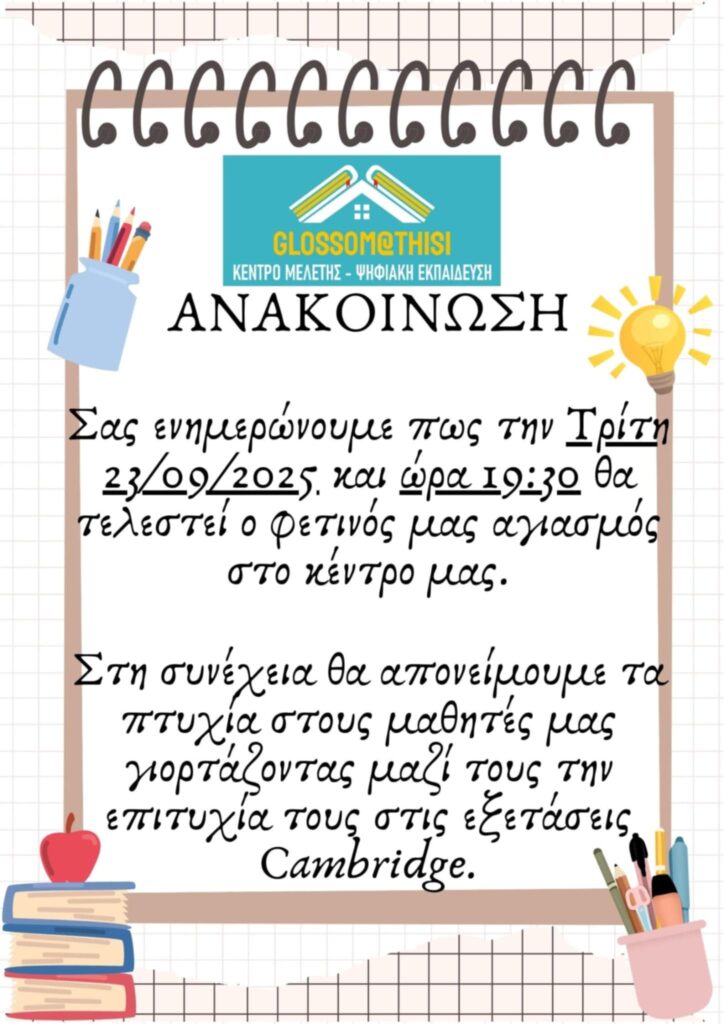 ΚΟΙΝΩΝΙΑ Αγιασμός και απονομή πτυχίων από τη “Glossom@thisi” την Τρίτη 23/9 στις 19.30 Ημερομηνία: 22 Σεπτεμβρίου 2025 Κοινοποιήση: FacebookPinterestWhatsApp Προηγούμενο άρθροΠαραδοσιακή βραδιά με τη Φυλασία στη Χασιά την Παρασκευή 26/9Επόμενο άρθροΣτο τμήμα προπονητής ιδιωτικού εκπαιδευτηρίου στα Άνω Λιόσια – Τον κατήγγειλε 17χρονος παίκτης για εξύβριση Μεγάλη επιχείρηση της ΕΛ.ΑΣ. στα Άνω Λιόσια – Eξάρθρωση κυκλώματος που έκλεβε αυτοκίνητα για εξαγωγή στην Αφρική 9 Νοεμβρίου 2025 Άνω Λιόσια – «Ναρκοσπίτια» με κάμερες και ρολά ασφαλείας: Συνελήφθησαν έξι άτομα σε μεγάλη επιχείρηση της ΕΛ.ΑΣ. ΕΓΚΛΗΜΑΤΙΚΟΤΗΤΑ Συμμετοχή του Ευάγγελου Λιάκου στη Διακοινοβουλευτική Διάσκεψη για τις Ψηφιακές Υπηρεσίες και την Καινοτομία στη Δανία ΠΟΛΙΤΙΚΗ “Τα Λαϊκά του Μίκη” την Παρασκευή 14 Νοεμβρίου στο Κλειστό της Ζωφριάς Άνω Λιοσίων – Είσοδος Ελεύθερη ΠΟΛΙΤΙΣΜΟΣ Στις 28/12 η βράβευση των νέων φοιτητών 2025 του Δήμου Φυλής με χρηματικό βραβείο 200 ευρώ – Απαραίτητες οι ηλεκτρονικές αιτήσεις ΚΟΙΝΩΝΙΑ “Όχι” στην αναστολή λειτουργίας του καταστήματος των ΕΛΤΑ Άνω Λιοσίων από τον Χρήστο Παππού ΑΥΤΟΔΙΟΙΚΗΣΗ παρομοια αρθρα ΚΟΙΝΩΝΙΑ Στις 28/12 η βράβευση των νέων φοιτητών 2025 του Δήμου Φυλής με χρηματικό βραβείο 200 ευρώ – Απαραίτητες οι ηλεκτρονικές αιτήσεις ΕΛΛΗΝΙΚΗ ΔΗΜΟΚΡΑΤΙΑ Άνω Λιόσια, 03/11/2025 ΔΗΜΟΣ ΦΥΛΗΣ Δ/ΝΣΗ ΚΟΙΝΩΝΙΚΗΣ ΠΡΟΣΤΑΣΙΑΣ ΚΑΙ ΠΑΙΔΕΙΑΣ ΤΜΗΜΑ ΠΑΙΔΕΙΑΣ ΚΑΙ ΔΙΑ ΒΙΟΥ ΜΑΘΗΣΗΣ ΤΗΛ.: 213 1603426 ΑΝΑΚΟΙΝΩΣΗ - Ο... ΚΟΙΝΩΝΙΑ Δωρεάν Σεμινάριο που σώζει ζωές στον Δήμο Φυλής την Κυριακή 9 Νοεμβρίου Δωρεάν σεμινάριο που στην κυριολεξία σώζει ζωές διοργανώνει εκ νέου μετά την μεγάλη επιτυχία του προηγούμενου, η Δημοτική... ΚΟΙΝΩΝΙΑ Συμμετοχή του 4ου Γυμνασίου Άνω Λιοσίων στο 5ο Φεστιβάλ Γρίφων στο Καστελλόριζο με την υποστήριξη του Δήμου Φυλής Από τις 17 έως τις 19 Οκτωβρίου 2025 πραγματοποιήθηκε στο ακριτικό Καστελλόριζο το 5ο Φεστιβάλ Γρίφων, ένα σημαντικό... ΚΟΙΝΩΝΙΑ Συγκλονίζει η 17χρονη Σταυρούλα που ακρωτηριάστηκε σε τροχαίο στη Χασιά τον περασμένο Φεβρουάριο (video) Ήταν στις 16 Φεβρουαρίου του 2025, όταν αυτοκίνητο εξετράπη της πορείας του λόγω υπερβολικής ταχύτητας και ανετράπη στη Χασιά,...