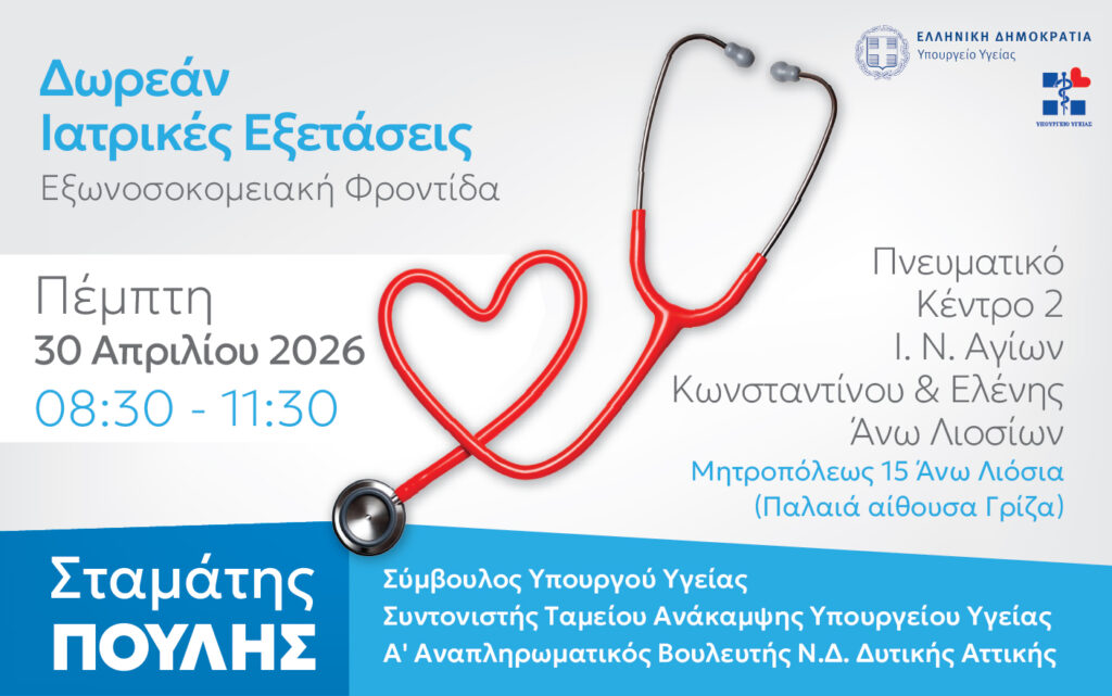 Στο πλαίσιο του Προγράμματος των Δωρεάν Εξωνοσοκομειακών Εξετάσεων που διενεργεί το Υπουργείο Υγείας, ο Σταμάτης Πουλής, Σύμβουλος του Υπουργού Υγείας και Α΄ Αναπληρωματικός Βουλευτής Ν.Δ. Δυτικής Αττικής, συντονίζει την δράση των δωρεάν ιατρικών εξετάσεων που θα πραγματοποιηθούν τηνΠέμπτη 30 Απριλίου και ώρα 8:30-11:30 στο Πνευματικό Κέντρο 2 του Ι.Ν. Αγίων Κωνσταντίνου & Ελένης Άνω Λιοσίων (Μητροπόλεως 15, Άνω Λιόσια- Παλαιά αίθουσα «Γρίζα») σε συνεργασία με τον Σεβασμιώτατο Μητροπολίτη Ιλίου, Αχαρνών και Πετρουπόλεως κ.κ. Αθηναγόρα, της Ιεράς Μητροπόλεως Ιλίου, Αχαρνών και Πετρουπόλεως και τον Πανοσιολογιώτατο Αρχιμανδρίτη π. Τίτο Χρήστου καθώς και το Π.Γ.Ν. «Αττικόν».
