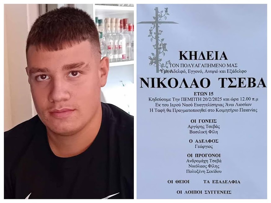 Την ερχόμενη Πέμπτη 20 Φεβρουαρίου, γονείς, συγγενείς, φίλοι και συμμαθητές θα συνοδεύσουν στην τελευταία του κατοικία τον 15χρονο συντοπίτη μας Νίκο Τσεβά. Ο νεαρός που τόσο άδικα έχασε τη ζωή του κατά τη διάρκεια του τραγικού τροχαίου στη Φυλή, όταν το αυτοκίνητο στο οποίο επέβαινε μαζί με φίλους προσέκρουσε σε δέντρο και αναποδογύρισε, θα αναπαυθεί στο Κοιμητήριο Παιανίας.