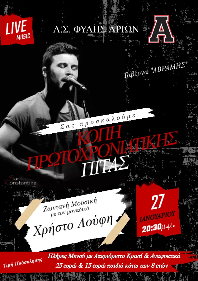 ΤΟ ΒΗΜΑ ΤΩΝ ΣΥΛΛΟΓΩΝ Α.Σ. Φυλής Αρίων – Κοπή πίτας στις 27/1 στον “Αβράμη” Ημερομηνία: 15 Ιανουαρίου 2024 Κοινοποιήση: FacebookPinterestWhatsApp Προηγούμενο άρθροΗπειρώτικο γλέντι το Σάββατο 20/1 στη λ. ΠάρνηθοςΕπόμενο άρθροΤο Σάββατο 20/1 η κοπή της πίτας του συλλόγου Βορειοηπειρωτών Δήμου Φυλής Στα Άνω Λιόσια χτυπά η καρδιά του kick boxing 16 Απριλίου 2026 Τέσσερις τελευταίες «Καραμέλες Ούζου» στο Από Μηχανής Θέατρο ΠΟΛΙΤΙΣΜΟΣ Ολοκλήρωση σύνταξης Επιχειρησιακού Σχεδίου για την εξασφάλιση κοινοχρήστων και κοινωφελών χώρων στον Δήμο Φυλής ΑΥΤΟΔΙΟΙΚΗΣΗ Νεφελώδης καιρός με μικρή πιθανότητα για ασθενείς τοπικές βροχές αύριο Κυριακή του Πάσχα – Πρόγνωση καιρού Άνω Λιοσίων, Φυλής & ν.Αττικής ΚΑΙΡΟΣ Καλό Πάσχα, χρόνια πολλά! – Cityface.gr ΠΟΛΙΤΙΣΜΟΣ Ισχυρό επενδυτικό ενδιαφέρον για την ανέγερση φοιτητικών εστιών 1.100 κλινών στο Πανεπιστήμιο Δυτικής Αττικής, μέσω ΣΔΙΤ ΚΟΙΝΩΝΙΑ παρομοια αρθρα ΤΟ ΒΗΜΑ ΤΩΝ ΣΥΛΛΟΓΩΝ Κάλαντα από τα “Λαζαράκια” του Συλλόγου Θεσσαλών στο Δημαρχείο της Φυλής "Ήρθε ο Λάζαρος, ήρθαν τα Βάγια"...τραγούδησαν και φέτος τα παιδάκια του Συλλόγου μας. Από νωρίς μαζεύτηκαν όλο χαρά στον... ΤΟ ΒΗΜΑ ΤΩΝ ΣΥΛΛΟΓΩΝ “Δυτικό Μέτωπο” – Εμμονή στην καύση και στις διαρκείς επεκτάσεις του ΧΥΤΑ Φυλής – Αοριστία και αδιέξοδα στον τομέα της διαχείρισης των απορριμμάτων της... Το ΔΥΤΙΚΟ ΜΕΤΩΠΟ αποτιμά τα αποτελέσματα των συναντήσεών του με επικεφαλής παρατάξεων του Περιφερειακού Συμβουλίου Αττικής και τον... ΤΟ ΒΗΜΑ ΤΩΝ ΣΥΛΛΟΓΩΝ Παρέμβαση στον Δήμο Φυλής την Τρίτη 31/3 και συνάντηση με τον Δήμαρχο για την ΕΛΜΕ Άνω Λιοσίων-Ζεφυρίου-Φυλής Απέναντι στα σημαντικά προβλήματα που ταλανίζουν τα σχολεία της περιοχής μας αποφασίσαμε να προχωρήσουμε σε παρέμβαση στον Δήμο Φυλής.... ΤΟ ΒΗΜΑ ΤΩΝ ΣΥΛΛΟΓΩΝ Δελτίο Τύπου σύσκεψης για την υγεία ΔΕΛΤΙΟ ΤΥΠΟΥ - Την Κυριακή 1η Μάρτη 2026 πραγματοποιήθηκε σύσκεψη συντονισμού και κοινής δράσης των Σωματείων, Συλλόγων και...