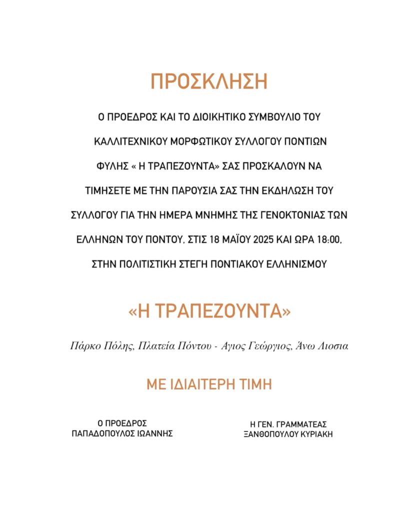 ΤΟ ΒΗΜΑ ΤΩΝ ΣΥΛΛΟΓΩΝ Εκδήλωση Μνήμης για τη Γενοκτονία των Ελλήνων του Πόντου την Κυριακή 18/5 από το Σύλλογο Ποντίων Φυλής η “Τραπεζούντα” Ημερομηνία: 13 Μαΐου 2025 Κοινοποιήση: FacebookPinterestWhatsApp Προηγούμενο άρθροTo Σάββατο 17/5 το Τουρνουά μίνι Βόλεϊ του “ΑΙΟΛΟΥ ΦΥΛΗΣ” στο κλειστό Γυμναστήριο ΣΠΑΡΤΑΚΟΣΕπόμενο άρθροΣυγκροτήθηκε σε σώμα το “Χοροδρώμενο” «Φυλακισμένοι» στα σπίτια τους οι κάτοικοι στα Άνω Λιόσια – Η οδός Αλιάκμονος μετατράπηκε σε αυτοκινητόδρομο βαρέων οχημάτων 12 Μαρτίου 2026 Σύλληψη και βαρύτατα πρόστιμα σε ασυνείδητο για απόρριψη λάστιχων και μπάζων στο Δήμο Φυλής ΚΑΘΗΜΕΡΙΝΟΤΗΤΑ Άνω Λιόσια – Επεισόδιο με μαθητές κατέληξε σε ξυλοδαρμό καθηγητή σε γυμνάσιο της περιοχής ΚΟΙΝΩΝΙΑ Πρωτοβουλία ουσίας και ευαισθησίας από τη Δημοτική Επιτροπή Ισότητας Φυλής κατά του σχολικού εκφοβισμού ΠΟΛΙΤΙΣΜΟΣ Δήμος Φυλής – Η πρώτη μονάδα «πράσινου» υδρογόνου στην Αττική ΑΥΤΟΔΙΟΙΚΗΣΗ Τιμήθηκαν Ελένη Λιάκου και Ιωάννα Τσεβά στη γιορτή για την Παγκόσμια Ημέρα της Γυναίκας στο ΚΑΠΗ Φυλής ΑΥΤΟΔΙΟΙΚΗΣΗ παρομοια αρθρα ΤΟ ΒΗΜΑ ΤΩΝ ΣΥΛΛΟΓΩΝ Δελτίο Τύπου σύσκεψης για την υγεία ΔΕΛΤΙΟ ΤΥΠΟΥ - Την Κυριακή 1η Μάρτη 2026 πραγματοποιήθηκε σύσκεψη συντονισμού και κοινής δράσης των Σωματείων, Συλλόγων και... ΤΟ ΒΗΜΑ ΤΩΝ ΣΥΛΛΟΓΩΝ Μεγαλειώδης εκδήλωση από το «ΧΟΡΟΔΡΩΜΕΝΟ» Το ετήσιο γλέντι για το 2026, μαζί με την παραδοσιακή εκδήλωση κοπής της Βασιλόπιτας αλλά και τα 10ετή... ΤΟ ΒΗΜΑ ΤΩΝ ΣΥΛΛΟΓΩΝ Την Παρασκευή 6 Φεβρουαρίου η βασιλόπιτα των εργαζομένων του Δήμου Φυλής ΤΟ ΒΗΜΑ ΤΩΝ ΣΥΛΛΟΓΩΝ “Δυτικό Μέτωπο” – Σημαντικές πρωτοβουλίες για συναντήσεις σχετικά με το ζήτημα του ΧΥΤΑ Φυλής ΔΕΛΤΙΟ ΤΥΠΟΥ - Με αφορμή την απόφαση της ΕΕ του ΕΔΣΝΑ να προχωρήσει σε νέα επέκταση του ΧΥΤΑ...