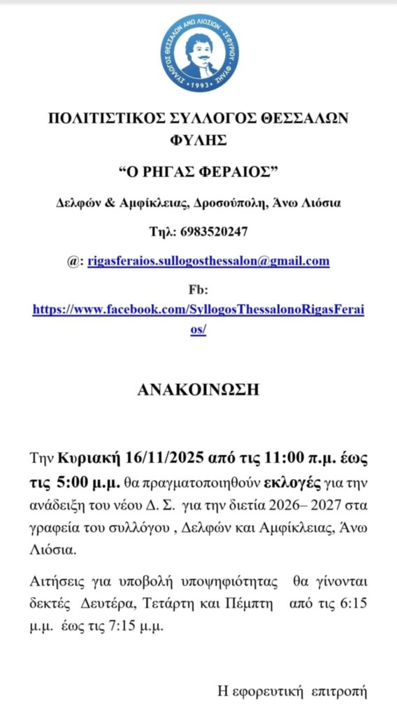 ΤΟ ΒΗΜΑ ΤΩΝ ΣΥΛΛΟΓΩΝ Εκλογές στον πολιτιστικό Σύλλογο Θεσσαλών “Ο Ρήγας Φεραίος” την Κυριακή 16/11 Ημερομηνία: 12 Νοεμβρίου 2025 Κοινοποιήση: FacebookPinterestWhatsApp Προηγούμενο άρθροΦροντιστήριο “Lingua Minds” – Συνάντηση Γονέων με την Ψυχοθεραπεύτρια Κυριακή Μερτζάνη το Σάββατο 22/11Επόμενο άρθρο“Τα Λαϊκά του Μίκη” την Παρασκευή 14 Νοεμβρίου στο Κλειστό της Ζωφριάς Άνω Λιοσίων – Είσοδος Ελεύθερη Το Σαββατοκύριακο 22 και 23 Νοεμβρίου η εξαίσια παράσταση ΑΓΓΕΛΑ από την Θεατρική Ομάδα του Δήμου Φυλής 12 Νοεμβρίου 2025 Χρήστος Παππούς: “Δεν θέλω να παραστήσω τον ήρωα στο θέμα της Χωματερής” ΑΥΤΟΔΙΟΙΚΗΣΗ Ημερίδα για την Ψυχική Υγεία Παιδιών κι Εφήβων την Τετάρτη 19/11 στο Πνευματικό Κέντρο Ζεφυρίου ΚΟΙΝΩΝΙΑ Την Κυριακή 16 Νοεμβρίου τα εγκαίνια της Έκθεσης Δώρων Αγάπης ΕΚΚΛΗΣΙΑ “Τα Λαϊκά του Μίκη” την Παρασκευή 14 Νοεμβρίου στο Κλειστό της Ζωφριάς Άνω Λιοσίων – Είσοδος Ελεύθερη ΔΙΑΣΚΕΔΑΣΗ Φροντιστήριο “Lingua Minds” – Συνάντηση Γονέων με την Ψυχοθεραπεύτρια Κυριακή Μερτζάνη το Σάββατο 22/11 ΠΟΛΙΤΙΣΜΟΣ παρομοια αρθρα ΤΟ ΒΗΜΑ ΤΩΝ ΣΥΛΛΟΓΩΝ Αύριο Κυριακή 2/11 η Εκλογοαπολογιστική Συνέλευση του Συλλόγου Θεσσαλών Φυλής “ΡΗΓΑΣ ΦΕΡΑΙΟΣ” ΤΟ ΒΗΜΑ ΤΩΝ ΣΥΛΛΟΓΩΝ Δελτίο Τύπου Σύσκεψης Γονέων-Εκπαιδευτικών Άνω Λιοσίων-Ζεφυρίου-Φυλής Ένωση Συλλόγων Γονέων Άνω Λιοσίων-Φυλής ΕΛΜΕ Άνω Λιοσίων-Ζεφυρίου-Φυλής Σύλλογος Εκπ/κών ΠΕ «Ηρώ Κωνσταντοπούλου» ΔΕΛΤΙΟ ΤΥΠΟΥ ΣΥΣΚΕΨΗΣ 15/10 Πραγματοποιήθηκε την Τετάρτη 15/10 σύσκεψη... ΤΟ ΒΗΜΑ ΤΩΝ ΣΥΛΛΟΓΩΝ Η καύση των σκουπιδιών (και) ως μέσο συγκάλυψης «αμαρτιών» – Δυτικό Μέτωπο Το ΔΥΤΙΚΟ ΜΕΤΩΠΟ σχολιάζει τα αποτελέσματα της διαχείρισης των αστικών στερεών αποβλήτων (ΑΣΑ) των δήμων της περιφέρειας Αττικής,... ΤΟ ΒΗΜΑ ΤΩΝ ΣΥΛΛΟΓΩΝ Αθρόα συμμετοχή στον 12ο ποδηλατικό γύρο της Ζωφριάς 12ος Ποδηλατικός Γύρος Ζωφριας με 190 ποδηλάτες. Πραγματοποιήθηκε στις 12 Οκτωβρίου 2025. Κληρώθηκαν 51 δώρα εκ των οποίων τα 19...