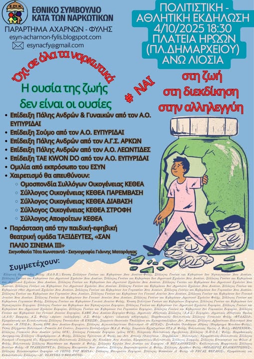 Το Παράρτημα Αχαρνών-Φυλής του ΕΣΥΝ πραγματοποιεί ανοιχτή αθλητική-πολιτιστική εκδήλωση ενάντια σε όλα τα ναρκωτικά, το Σάββατο 4 Οκτωβρίου 2025 και ώρα 18:30 στην Κεντρική Πλατεία (Πλ. Ηρώων) των Άνω Λιοσίων.