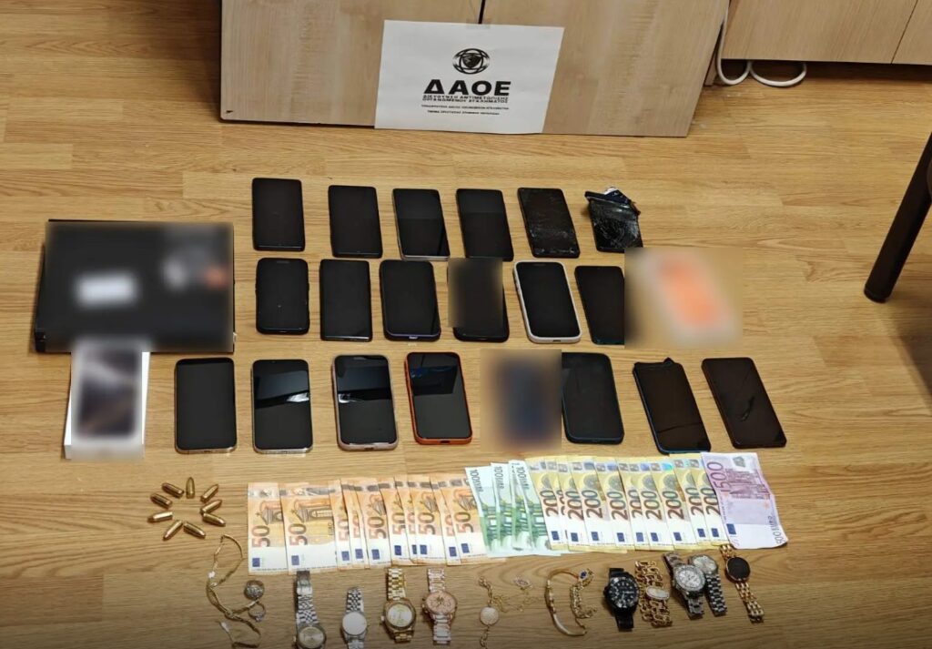Κατά τις έρευνες που ακολούθησαν κατασχέθηκαν συνολικά 20 κινητά τηλέφωνα και 22 κάρτες SIM, δέκα επώνυμα ρολόγια, τέσσερις χρυσές αλυσίδες και δύο δαχτυλίδια. Επιπλέον εντοπίστηκαν εννέα φυσίγγια των 9 χιλιοστών, ένα σύστημα καταγραφής, καθώς και δύο αυτοκίνητα. Το ένα από τα οχήματα φέρεται να είχε χρησιμοποιηθεί σε ληστεία που είχε πραγματοποιηθεί τον Ιούλιο του 2025, με δράστη που προσποιήθηκε υπάλληλο του ΔΕΔΔΗΕ. Παράλληλα κατασχέθηκε και το χρηματικό ποσό των 3.900 ευρώ.