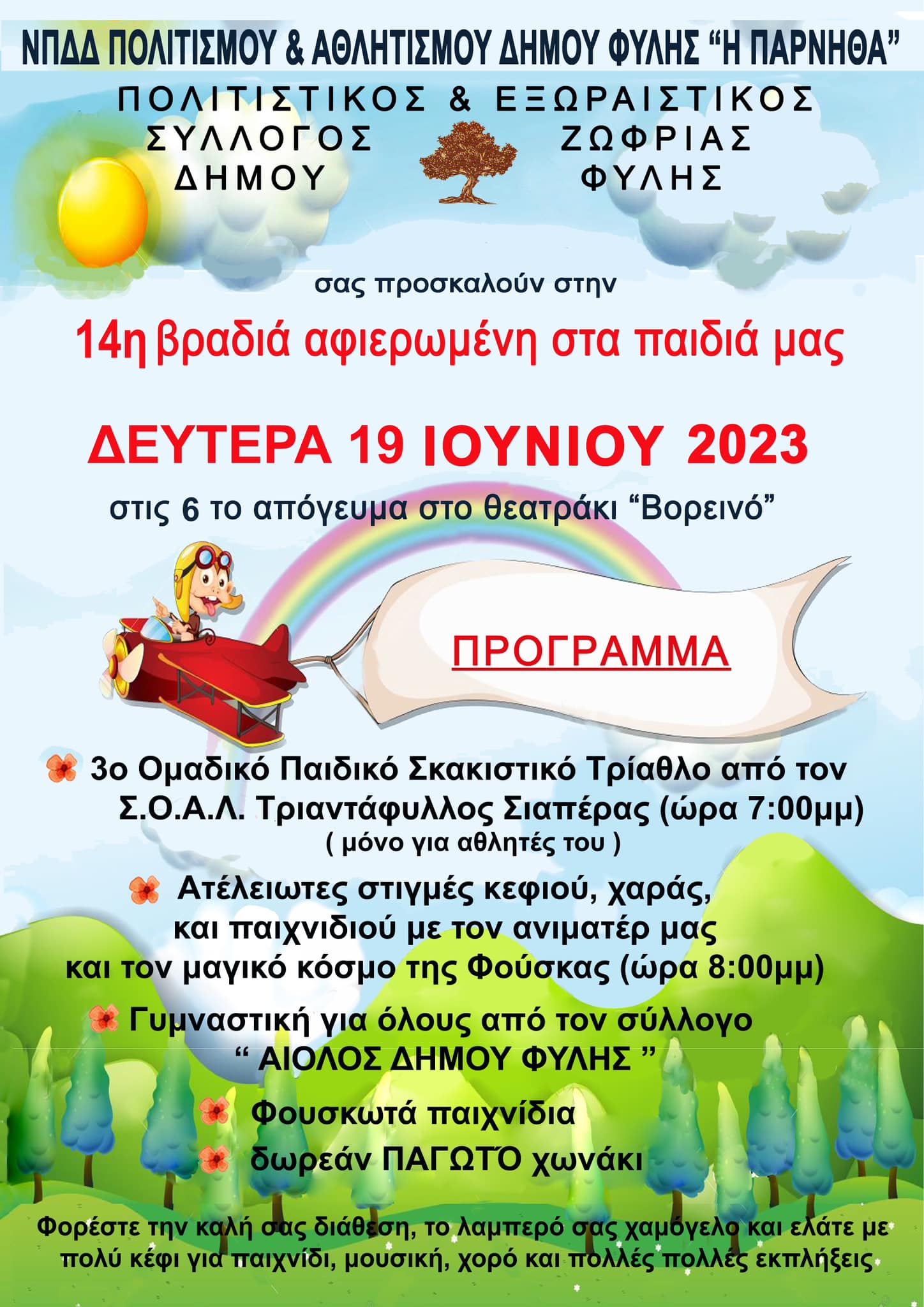 ΠΟΛΙΤΙΣΜΟΣ Βραδιά αφιερωμένη στα παιδιά τη Δευτέρα 19/6 στο “Βορεινό” Ημερομηνία: 13 Ιουνίου 2023 Κοινοποιήση: FacebookPinterestWhatsApp Προηγούμενο άρθροΛαϊκή βραδιά από τον σύλλογο Ζωφριάς και το Ν.Π.Δ.Δ. Πάρνηθα το Σάββατο 17/6Επόμενο άρθροΕπιτυχημένη και μαζική η εκδήλωση του ΕΣΥΝ στα Άνω Λιόσια για την Παγκόσμια Ημέρα κατά των Ναρκωτικών Άνω Λιόσια – «Τσουχτερό» πρόστιμο σε πρατήριο καυσίμων για μη ενημέρωση των τιμών 3 Απριλίου 2026 Το Σάββατο 04/04 (11:00) η λιτάνευση της Εικόνας της Ι.Μ. Κλειστών προς τη Φυλή ΕΚΚΛΗΣΙΑ Τη Μ.Δευτέρα 6/4 ξεκινούν οι αιτήσεις για τις 28 προσλήψεις στον Δήμο Φυλής ΚΟΙΝΩΝΙΑ Νέο έργο στο Καστελλόριζο με τη συμβολή του Δήμου Φυλής ΑΥΤΟΔΙΟΙΚΗΣΗ Βροχερός καιρός και σήμερα Πέμπτη 02/04 – Πρόγνωση καιρού Άνω Λιοσίων, Φυλής & Ν.Αττικής ΚΑΙΡΟΣ Φεστιβάλ Γυμναστικής “Roundabout GfA Festival 2026” στονΔήμο Φυλής 20 και 21 Ιουνίου από το σύλλογο ΕΥΠΥΡΙΔΕΣ ΑΘΛΗΤΙΣΜΟΣ παρομοια αρθρα ΠΟΛΙΤΙΣΜΟΣ Με κατάνυξη και υπό βροχή η λιτάνευση της Εικόνας της Μονής Κλειστών στα Άνω Λιόσια Με ιδιαίτερη ευλάβεια και παρά τις αντίξοες καιρικές συνθήκες, υποδέχθηκαν οι πιστοί την Εικόνα της Μονής Κλειστών στα... ΠΟΛΙΤΙΣΜΟΣ Λαμπρός εορτασμός της 25ης Μαρτίου στα Άνω Λιόσια με μεγάλη συμμετοχή στην παρέλαση Με την καθιερωμένη παρέλαση, παρουσία επισήμων και πλήθους κόσμου, κορυφώθηκαν την Τετάρτη 25 Μαρτίου 2026, στα Άνω Λιόσια,... ΠΟΛΙΤΙΣΜΟΣ Το Ζεφύρι γιόρτασε την Εθνική Επέτειο της 25ης Μαρτίου και τον Ευαγγελισμό της Θεοτόκου Με μεγαλοπρέπεια και περηφάνια γιορτάστηκε την Τετάρτη 25 Μαρτίου, στη Δημοτική Κοινότητα Ζεφυρίου η επέτειος της εθνικής παλιγγενεσίας... ΠΟΛΙΤΙΣΜΟΣ Oι εκδηλώσεις για την επέτειο της 25ης Μαρτίου στη Δημοτική Κοινότητα Φυλής Με υπερηφάνεια και μεγαλοπρέπεια τιμήθηκε η Επέτειος της 25ης Μαρτίου 1821 στη Δημοτική Κοινότητα Φυλής, και τη συμμετοχή...