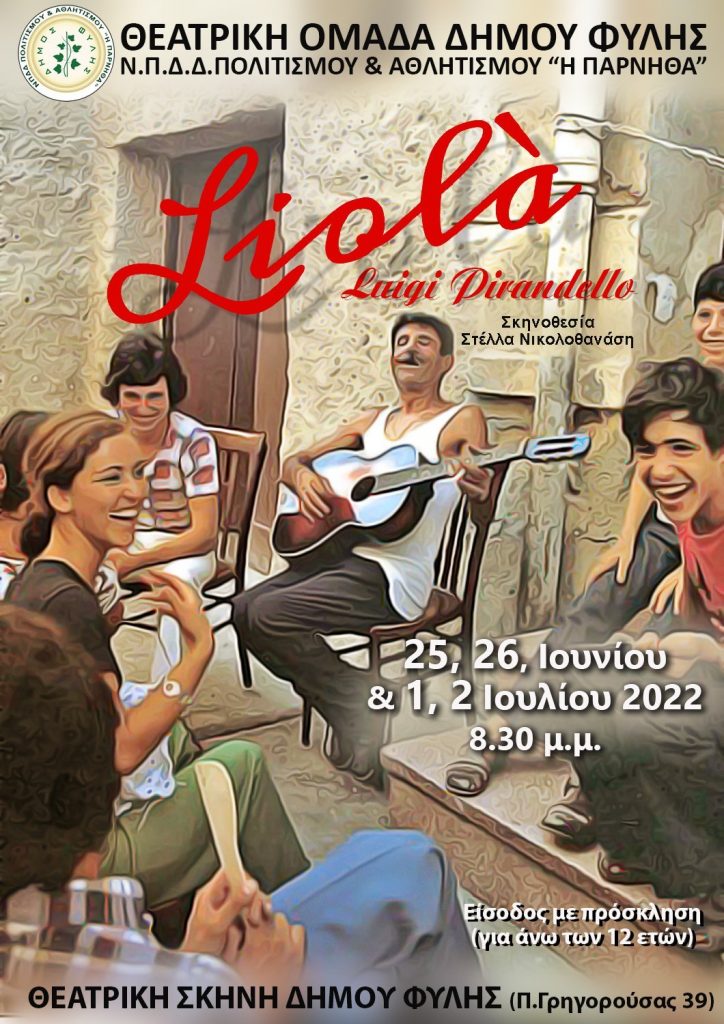 Με το αριστούργημα του Λουίτζι Πιραντέλλο “Λιολά” κλείνει τον κύκλο των παραστάσεών της η Θεατρική Ομάδα του Δήμου Φυλής και σας περιμένει στις 25 και 26 Ιουνίου αλλά και στη 1 και 2 Ιουλίου στη θεατρική σκηνή του δήμου μας!