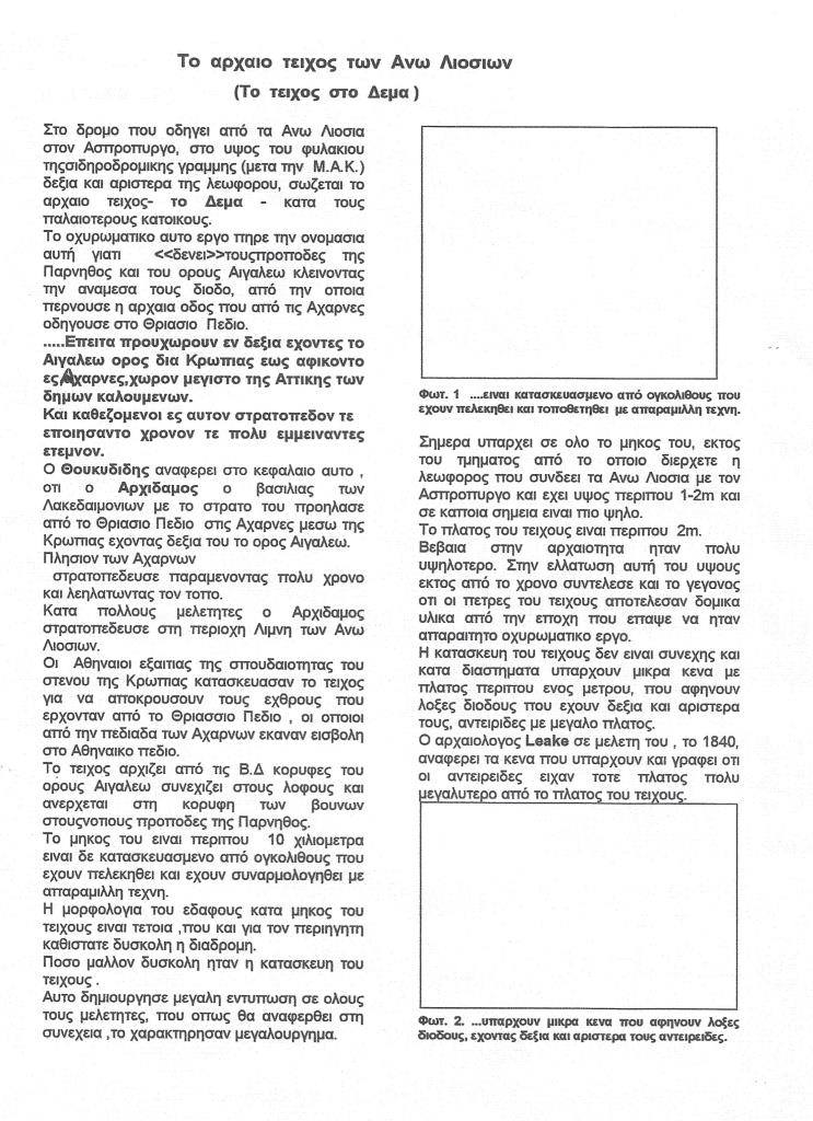 Στο δρόμο που οδηγεί από τα Άνω Λιόσια στον Ασπρόπυργο, στο ύψος του φυλακίου της σιδηροδρομικής γραμμής (μετά την Μ.Α.Κ.) δεξιά και αριστερά της λεωφόρου, σώζεται το αρχαίο τείχος- το Δέμα – κατά τους παλαιότερους κατοίκους.