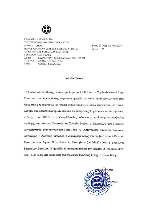 ΠΟΛΙΤΙΣΜΟΣ Εκπαιδευτική Ημερίδα για την Ενδοοικογενειακή Βία την Πέμπτη 6/3 στο Δημαρχείο Φυλής Ημερομηνία: 5 Μαρτίου 2025 Κοινοποιήση: FacebookPinterestWhatsApp Προηγούμενο άρθροΕκδήλωση για την Παγκόσμια Ημέρα της Γυναίκας το Σάββατο 8 ΜαρτίουΕπόμενο άρθροΠανελλήνια Ημέρα κατά της Σχολικής Βίας και του Εκφοβισμού στο 1ο Γυμνάσιο Ζεφυρίου Άνω Λιόσια – Επεισόδιο με μαθητές κατέληξε σε ξυλοδαρμό καθηγητή σε γυμνάσιο της περιοχής 10 Μαρτίου 2026 Πρωτοβουλία ουσίας και ευαισθησίας από τη Δημοτική Επιτροπή Ισότητας Φυλής κατά του σχολικού εκφοβισμού ΠΟΛΙΤΙΣΜΟΣ Δήμος Φυλής – Η πρώτη μονάδα «πράσινου» υδρογόνου στην Αττική ΑΥΤΟΔΙΟΙΚΗΣΗ Τιμήθηκαν Ελένη Λιάκου και Ιωάννα Τσεβά στη γιορτή για την Παγκόσμια Ημέρα της Γυναίκας στο ΚΑΠΗ Φυλής ΑΥΤΟΔΙΟΙΚΗΣΗ Πώς δρούσε το τηλεφωνικό κέντρο απατεώνων στο Ζεφύρι – Ο ρόλος «τηλεφωνητών» και «εισπρακτόρων» ΕΓΚΛΗΜΑΤΙΚΟΤΗΤΑ Το Σάββατο 7/3 στα Άνω Λιόσια τα προκριματικά του σχολικού πρωταθλήματος Σκακιού Αττικής ΠΟΛΙΤΙΣΜΟΣ παρομοια αρθρα ΠΟΛΙΤΙΣΜΟΣ Πρωτοβουλία ουσίας και ευαισθησίας από τη Δημοτική Επιτροπή Ισότητας Φυλής κατά του σχολικού εκφοβισμού Με ιδιαίτερη έμφαση στις αξίες του αλληλοσεβασμού και της κοινωνικής συνοχής, η Δημοτική Επιτροπή Ισότητας Φυλής πρωτοστάτησε σε... ΠΟΛΙΤΙΣΜΟΣ Το Σάββατο 7/3 στα Άνω Λιόσια τα προκριματικά του σχολικού πρωταθλήματος Σκακιού Αττικής Ο Δήμος Φυλής, σε συνεργασία με τον Σκακιστικό Όμιλο Άνω Λιοσίων «Τριαντάφυλλο Σιαπέρα», με την υποστήριξη της Ένωσης... ΠΟΛΙΤΙΣΜΟΣ Παρασκευή 6/3-Σημαντική εκδήλωση στην Πλατεία Ηρώων για την Ημέρα κατά της Σχολικής Βίας από την Επιτροπή Ισότητας του Δήμου Φυλής-Σχολεία και Συλλόγους ΠΟΛΙΤΙΣΜΟΣ Δωρεά μυελού των οστών – Ομιλία στο Δημαρχείο των Άνω Λιοσίων την Πέμπτη 5 Μαρτίου ΔΕΛΤΙΟ ΤΥΠΟΥ - Ο Δήμος Φυλής, μέσω της Κοινωνικής Υπηρεσίας, το ΚΕΠ Υγείας, το Διευρυμένο Κέντρο Κοινότητας και...