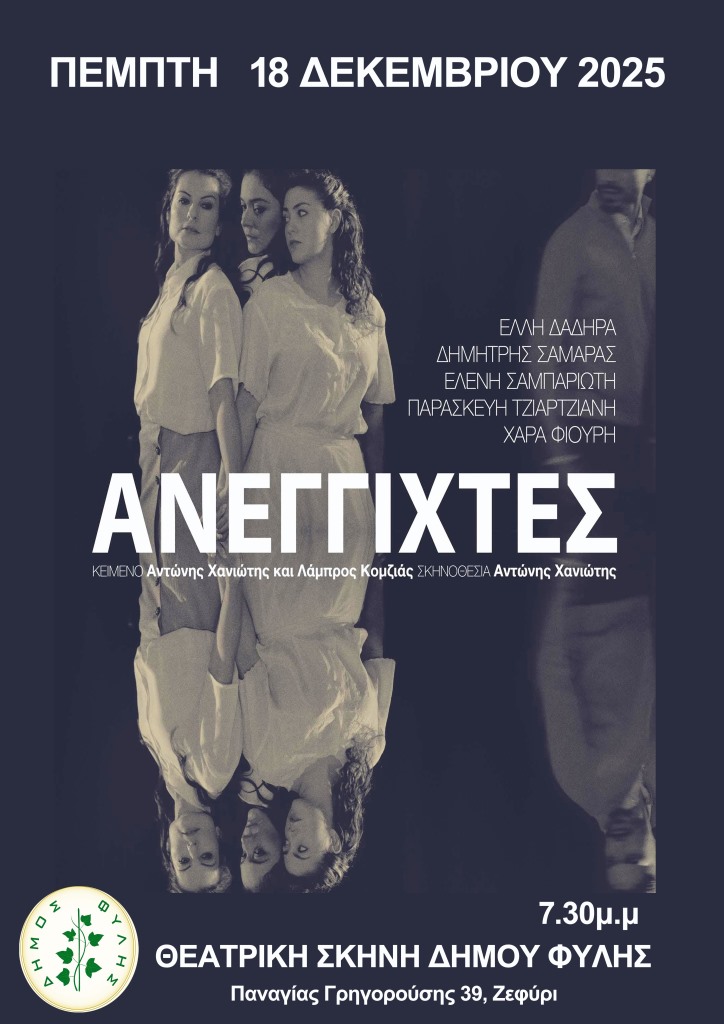 ΠΟΛΙΤΙΣΜΟΣ Η θεατρική Παράσταση ΑΝΕΓΓΙΧΤΕΣ την Πέμπτη 18 Δεκεμβρίου στη θεατρική Σκηνή του Δήμου Φυλής – Είσοδος Ελεύθερη Ημερομηνία: 11 Δεκεμβρίου 2025 Κοινοποιήση: FacebookPinterestWhatsApp Προηγούμενο άρθροΧριστουγεννιάτικη γιορτή στο Δημοτικό Κολυμβητήριο την Τετάρτη 17/12 με εκπλήξεις και την DJ EIRINI STERIANOYΕπόμενο άρθροΤην Τετάρτη 17/12 η Χριστουγεννιάτικη Συναυλία του Δημοτικού Ωδείου και της Φιλαρμονικής του Δήμου Φυλής O ελληνικός Ερυθρός Σταυρός διοργανώνει Διαδικτυακό Σεμινάριο με θέμα: «Πρόληψη και διαχείριση της φυματίωσης: Ο Ρόλος των Φροντιστών» (21/4) 20 Απριλίου 2026 Τραγωδία στη λεωφόρο ΝΑΤΟ – Οδηγός μηχανής έχασε τη ζωή του σε δυστύχημα ΚΑΘΗΜΕΡΙΝΟΤΗΤΑ Στα Άνω Λιόσια χτυπά η καρδιά του kick boxing ΔΗΜΟΣ ΦΥΛΗΣ Τέσσερις τελευταίες «Καραμέλες Ούζου» στο Από Μηχανής Θέατρο ΠΟΛΙΤΙΣΜΟΣ Ολοκλήρωση σύνταξης Επιχειρησιακού Σχεδίου για την εξασφάλιση κοινοχρήστων και κοινωφελών χώρων στον Δήμο Φυλής ΑΥΤΟΔΙΟΙΚΗΣΗ Νεφελώδης καιρός με μικρή πιθανότητα για ασθενείς τοπικές βροχές αύριο Κυριακή του Πάσχα – Πρόγνωση καιρού Άνω Λιοσίων, Φυλής & ν.Αττικής ΚΑΙΡΟΣ παρομοια αρθρα ΠΟΛΙΤΙΣΜΟΣ Τέσσερις τελευταίες «Καραμέλες Ούζου» στο Από Μηχανής Θέατρο Η ανατρεπτική κωμωδία μυστηρίου «Καραμέλες Ούζου», σε κείμενο του βραβευμένου Γιάννη Γαλανόπουλου και σκηνοθεσία Σταύρου Νικολαΐδη, μετά από μια επιτυχημένη καλοκαιρινή περιοδεία σε όλη την... ΠΟΛΙΤΙΣΜΟΣ Καλό Πάσχα, χρόνια πολλά! – Cityface.gr ΠΟΛΙΤΙΣΜΟΣ Δήμος Φυλής – Απολογισμός δράσεων για τα αδέσποτα ζώα συντροφιάς για το 2025 Με αφορμή την Παγκόσμια Ημέρα Αδέσποτων Ζώων (4 Απριλίου 2026), ο Δήμος Φυλής παρουσιάζει τον απολογισμό του Δημοτικού... ΠΟΛΙΤΙΣΜΟΣ Με κατάνυξη και υπό βροχή η λιτάνευση της Εικόνας της Μονής Κλειστών στα Άνω Λιόσια Με ιδιαίτερη ευλάβεια και παρά τις αντίξοες καιρικές συνθήκες, υποδέχθηκαν οι πιστοί την Εικόνα της Μονής Κλειστών στα...