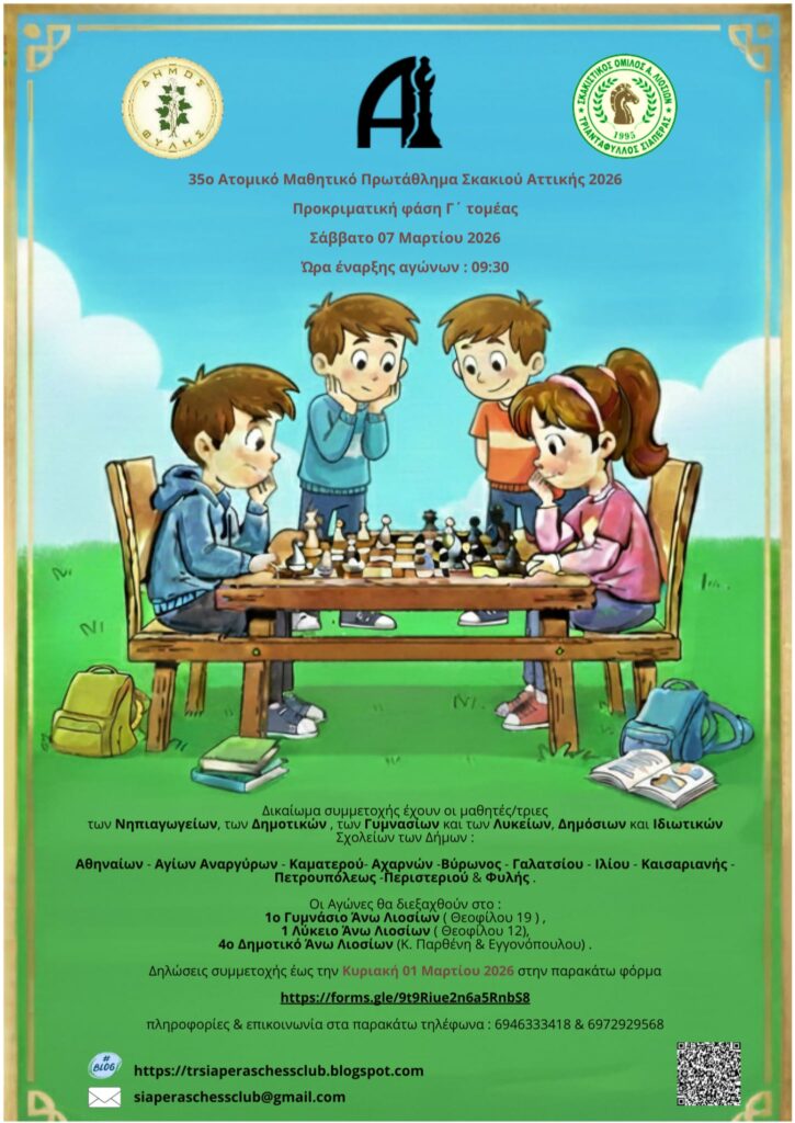 Ο Δήμος Φυλής, σε συνεργασία με τον Σκακιστικό Όμιλο Άνω Λιοσίων «Τριαντάφυλλο Σιαπέρα», με την υποστήριξη της Ένωσης Σκακιστικών Σωματείων Νομού Αττικής (Ε.Σ.Σ.Ν.Α.) και του Δημοτικού Κέντρου Πνεύματος Άνω Λιοσίων, προκηρύσσει το Προκριματικό Ατομικό Πρωτάθλημα Σκακιού Μαθητών – Μαθητριών Γ΄ Τομέα Αττικής 2026, ενόψει της πανελλήνιας διοργάνωσης.