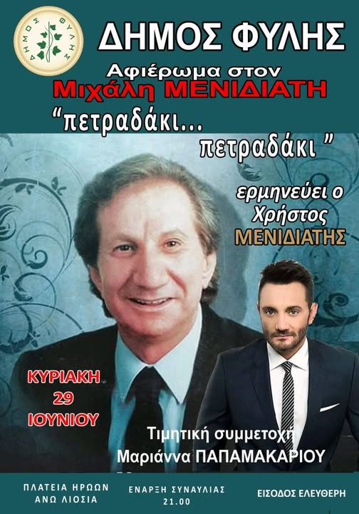 Συναύλια αφιερωμένη στον Μιχάλη Μενιδιάτη την Κυριακή 29/6 στην Πλατεία Ηρώων