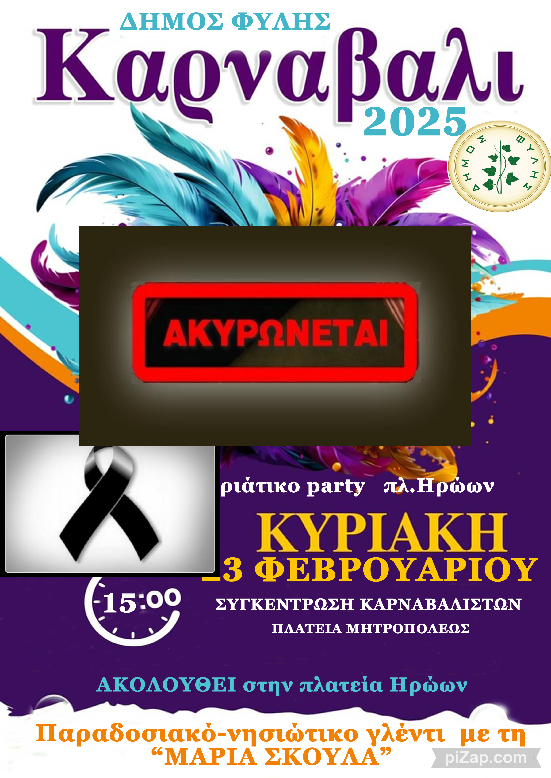 ΚΑΘΗΜΕΡΙΝΟΤΗΤΑ Ακυρώνεται λόγω πένθους το Καρναβάλι του Δήμου Φυλής Ημερομηνία: 18 Φεβρουαρίου 2025 Κοινοποιήση: FacebookPinterestWhatsApp Ο Δήμος Φυλής ανακοινώνει την ακύρωση της εκδήλωσης του καρναβαλιού, σε ένδειξη συμπαράστασης στο πένθος της οικογένειας του 15χρονου Νικόλαου Τσεβά, ο οποίος έχασε τη ζωή του στο τραγικό δυστύχημα που σημειώθηκε στη Φυλή. Προηγούμενο άρθροΆνω Λιόσια – Την Πέμπτη 20/2 στην Ευαγγελίστρια η κηδεία του 15χρονου ΝικόλαΕπόμενο άρθροΗμέρα πένθους η Πέμπτη 20/2 για το 2ο Λύκειο Άνω Λιοσίων Άνω Λιόσια – Επεισόδιο με μαθητές κατέληξε σε ξυλοδαρμό καθηγητή σε γυμνάσιο της περιοχής 10 Μαρτίου 2026 Πρωτοβουλία ουσίας και ευαισθησίας από τη Δημοτική Επιτροπή Ισότητας Φυλής κατά του σχολικού εκφοβισμού ΠΟΛΙΤΙΣΜΟΣ Δήμος Φυλής – Η πρώτη μονάδα «πράσινου» υδρογόνου στην Αττική ΑΥΤΟΔΙΟΙΚΗΣΗ Τιμήθηκαν Ελένη Λιάκου και Ιωάννα Τσεβά στη γιορτή για την Παγκόσμια Ημέρα της Γυναίκας στο ΚΑΠΗ Φυλής ΑΥΤΟΔΙΟΙΚΗΣΗ Πώς δρούσε το τηλεφωνικό κέντρο απατεώνων στο Ζεφύρι – Ο ρόλος «τηλεφωνητών» και «εισπρακτόρων» ΕΓΚΛΗΜΑΤΙΚΟΤΗΤΑ Το Σάββατο 7/3 στα Άνω Λιόσια τα προκριματικά του σχολικού πρωταθλήματος Σκακιού Αττικής ΠΟΛΙΤΙΣΜΟΣ παρομοια αρθρα ΚΑΘΗΜΕΡΙΝΟΤΗΤΑ Οργή και αγανάκτηση στο Δήμο Φυλής και στην εκπαιδευτική κοινότητα για τον βανδαλισμό στο 1ο Γυμνάσιο Οργή και αγανάκτηση έχει προκαλέσει στην εκπαιδευτική κοινότητα και στο Δήμο Φυλής το νέο περιστατικό βανδαλισμού στο διδακτήριο... ΚΑΘΗΜΕΡΙΝΟΤΗΤΑ Αττική οδός – Αποκατάσταση κυκλοφορίας στη σήραγγα των Άνω Λιοσίων Η κυκλοφορία στη σήραγγα των Άνω Λιοσίων (Αττική οδός, στο ρεύμα προς το αεροδρόμιο) αποκαθίσταται δύο ημέρες νωρίτερα... ΚΑΘΗΜΕΡΙΝΟΤΗΤΑ Άνω Λιόσια – Συνεχίζεται για τρίτη ημέρα το κυκλοφοριακό κομφούζιο Σε κατάσταση… οδικής πολιορκίας βρίσκονται και σήμερα τα Άνω Λιόσια, με τη λεωφόρο Φυλής να παραμένει στα κόκκινα,... ΚΑΘΗΜΕΡΙΝΟΤΗΤΑ Προαστιακός – Ταλαιπωρούν γιατί μπορούν Την Τρίτη της περασμένης εβδομάδας, πολλοί από τους επιβάτες που χρησιμοποιούν το σταθμό του Προαστιακού στα Άνω Λιόσια...