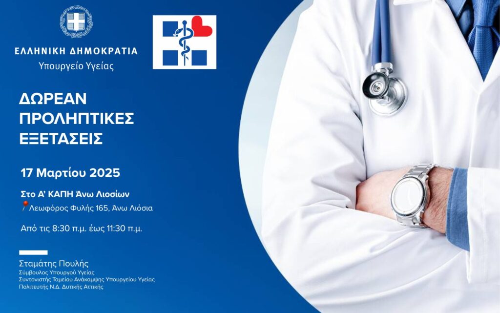 Στο πλαίσιο του Προγράμματος των Δωρεάν Προληπτικών Εξετάσεων στα ΚΑΠΗ όλης της χώρας που διενεργεί το Υπουργείο Υγείας, ο Σταμάτης Πουλής, Σύμβουλος του Υπουργού Υγείας, Συντονιστής του Ταμείου Ανάκαμψης και Ανθεκτικότητας του Υπουργείου Υγείας και Α¨Αναπληρωματικός Βουλευτής Ν.Δ. Δυτικής Αττικής συντονίζει την δράση των δωρεάν προληπτικών εξετάσεων που θα πραγματοποιηθεί την Δευτέρα 17 Μαρτίου 2025 στο Α΄ΚΑΠΗ Άνω Λιοσίων (Λεωφ.Φυλής 165, Άνω Λιόσια) από τις 8:30 π.μ. έως τις 11:30 π.μ.
