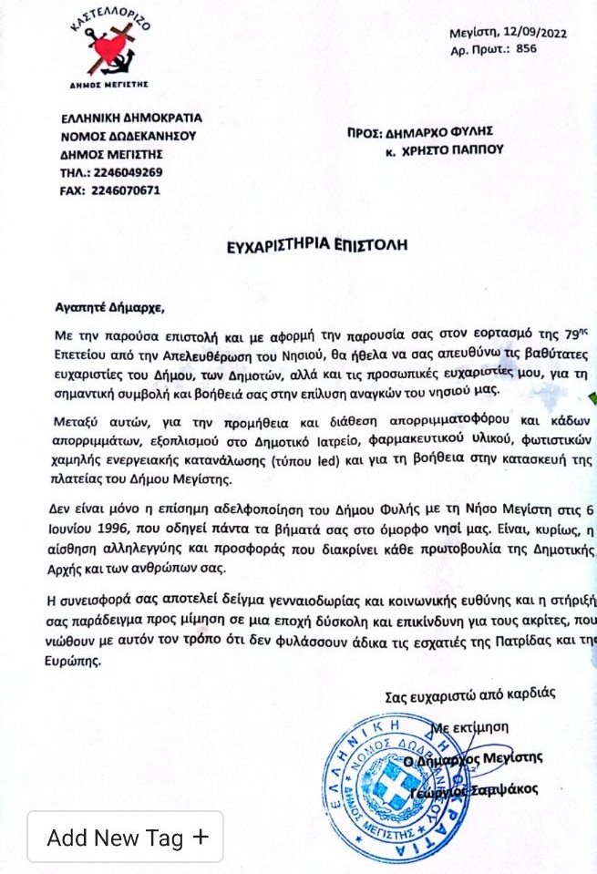 Συγκινητική, τέλος, είναι η ευχαριστήρια επιστολή του Δήμου Μεγίστης, η οποία αναφέρεται στη συνδρομή του Δήμου Φυλής. Ειδικότερα ο Δήμαρχος Γιώργος Σαμψάκος αναφέρθηκε  στην προμήθεια και διάθεση απορριμματοφόρου,  κάδων, φωτιστικών σωμάτων LED, εξοπλισμού και ιατροφαρμακευτικού υλικού για το Δημοτικό Ιατρείο κ.ά.