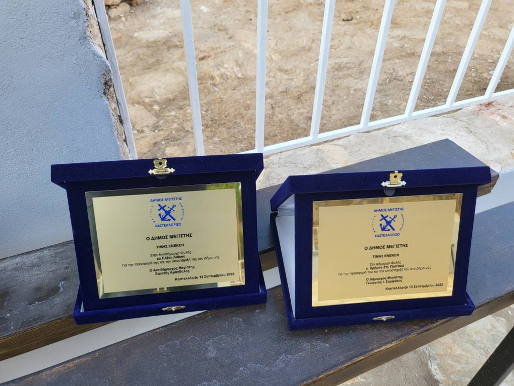 Ο Δήμαρχος Μεγίστης απένειμε τιμητικές πλακέτες στο Δήμαρχο Χρήστο Παππού και στην Αντιδήμαρχο Ελένη Λιάκου, ως μέλος της οικογένειας του εκλιπόντος Δημάρχου Φυλής Νικολάου Λιάκου, ο οποίος υπήρξε ο εμπνευστής της αδελφοποίησης του Δήμου Φυλής με το Καστελλόριζο. Επίσης οι δύο Δήμαρχοι αντάλλαξαν αναμνηστικά δώρα.