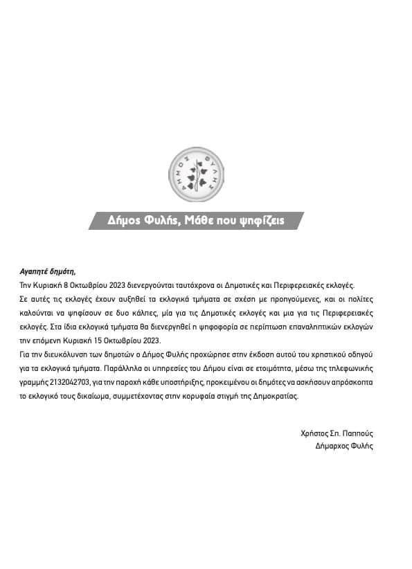 ΑΥΤΟΔΙΟΙΚΗΣΗ Εκλογές – Μάθε που ψηφίζεις στον Δήμο Φυλής Ημερομηνία: 7 Οκτωβρίου 2023 Κοινοποιήση: FacebookPinterestWhatsApp Προηγούμενο άρθροΧρήστος Ρούσσας – «ΑλλάΖουμε»: Μια παράταξη με παρόν, παρελθόν και μέλλονΕπόμενο άρθροΔείτε – Το προεκλογικό μήνυμα του υποψηφίου Μηνά Ζέρβα Τραγωδία στη λεωφόρο ΝΑΤΟ – Οδηγός μηχανής έχασε τη ζωή του σε δυστύχημα 16 Απριλίου 2026 Στα Άνω Λιόσια χτυπά η καρδιά του kick boxing ΔΗΜΟΣ ΦΥΛΗΣ Τέσσερις τελευταίες «Καραμέλες Ούζου» στο Από Μηχανής Θέατρο ΠΟΛΙΤΙΣΜΟΣ Ολοκλήρωση σύνταξης Επιχειρησιακού Σχεδίου για την εξασφάλιση κοινοχρήστων και κοινωφελών χώρων στον Δήμο Φυλής ΑΥΤΟΔΙΟΙΚΗΣΗ Νεφελώδης καιρός με μικρή πιθανότητα για ασθενείς τοπικές βροχές αύριο Κυριακή του Πάσχα – Πρόγνωση καιρού Άνω Λιοσίων, Φυλής & ν.Αττικής ΚΑΙΡΟΣ Καλό Πάσχα, χρόνια πολλά! – Cityface.gr ΠΟΛΙΤΙΣΜΟΣ παρομοια αρθρα ΑΥΤΟΔΙΟΙΚΗΣΗ Ολοκλήρωση σύνταξης Επιχειρησιακού Σχεδίου για την εξασφάλιση κοινοχρήστων και κοινωφελών χώρων στον Δήμο Φυλής Ο Δήμος Φυλής ανακοινώνει την ολοκλήρωση της Σύνταξης Επιχειρησιακού Σχεδίου για την Εξασφάλιση κοινοχρήστων και κοινωφελών χώρων στο... ΑΥΤΟΔΙΟΙΚΗΣΗ Δεν κατατέθηκαν προσφορές για το επιχειρηματικό πάρκο Φυλής, ανακοίνωσε το Υπερταμείο Χωρίς προσφορές έληξε ο διεθνής διαγωνισμός για την ανάπτυξη, λειτουργία και συντήρηση του Επιχειρηματικού Πάρκου στη θέση «Σπηλιές»... ΑΥΤΟΔΙΟΙΚΗΣΗ Νέο έργο στο Καστελλόριζο με τη συμβολή του Δήμου Φυλής Συνεχίζεται η υποστήριξη του ακριτικού Καστελλόριζου (Μεγίστης) από το Δήμο Φυλής. Πιστός στη δέσμευσή του για στήριξη του... ΑΥΤΟΔΙΟΙΚΗΣΗ Χρήστος Παππούς – “Στόχος να δημιουργήσουμε δουλειές για τους συνδημότες μας” Πάρκο Ηλιακής Ενέργειας – Φοιτητούπολη – Logistics – Πρώτη Μονάδα Πράσινου Υδρογόνου οι επενδυτικές πρωτοβουλίες του Δήμου Φυλής Στις...