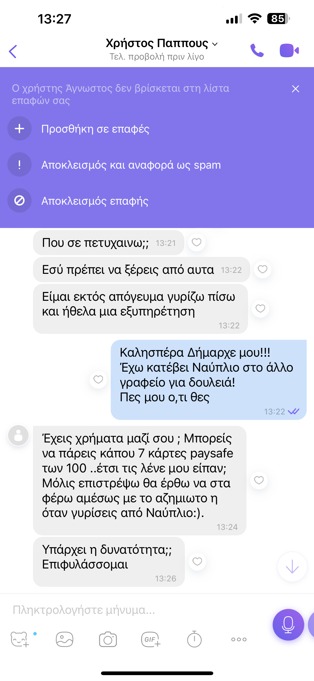 Συγκεκριμένα, παρακαλούνται να αγνοήσουν μήνυμα στα κινητά τους, μέσω της εφαρμογής viber, με την οποία εμφανίζεται ο Δήμαρχος Φυλής Χρήστος Παππούς να τους ζητά να αγοράσουν προπληρωμένες κάρτες pay safe, πληρώνοντας, ηλεκτρονικά, το αντίτιμό τους. Ο τηλεφωνικός αριθμός από τον οποίο προέρχεται το μήνυμα εξαπάτησης είναι ο 6974741722.