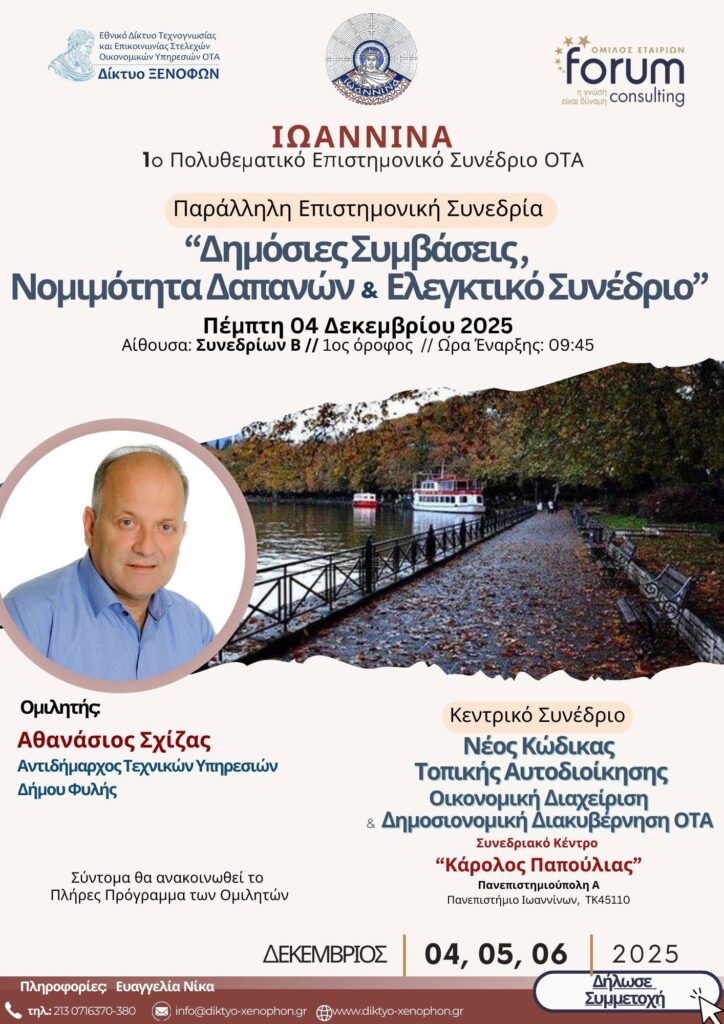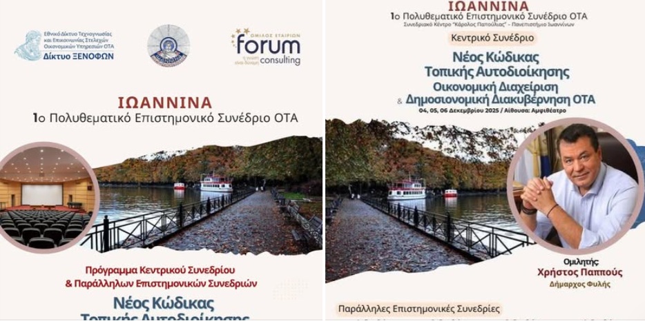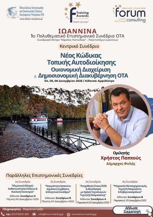 Στο 1ο Πολυθεματικό Επιστημονικό Συνέδριο ΟΤΑ, που θα πραγματοποιηθεί στα Ιωάννινα στις 4, 5 και 6 Δεκεμβρίου 2025, με Κεντρικό θέμα :“Νέος Κώδικας Τοπικής Αυτοδιοίκησης – Οικονομική Διαχείριση και Δημοσιονομική Διακυβέρνηση ΟΤΑ” αλλά και πολλές παράλληλες συνεδρίες, θα λάβει μέρος ο Δήμος Φυλής.