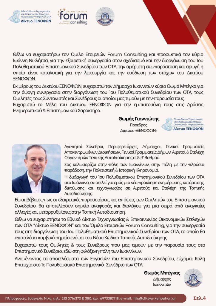 Το 1ο Πολυθεματικό Επιστημονικό Συνέδριο που θα διεξαχθεί στο Συνεδριακό Κέντρο «Κάρολος Παπούλιας» – Πανεπιστήμιο Ιωαννίνων, αποτελεί κομβικό σημείο συνάντησης Αιρετών, Τεχνοκρατών και Υπηρεσιακών Παραγόντων της Τοπικής Αυτοδιοίκησης και διοργανώνεται από το Εθνικό Δίκτυο Τεχνογνωσίας και Επικοινωνίας Στελεχών Οικονομικών Υπηρεσιών των ΟΤΑ “Δίκτυο ΞΕΝΟΦΩΝ” και τον Όμιλο Εταιρειών Forum Consulting.