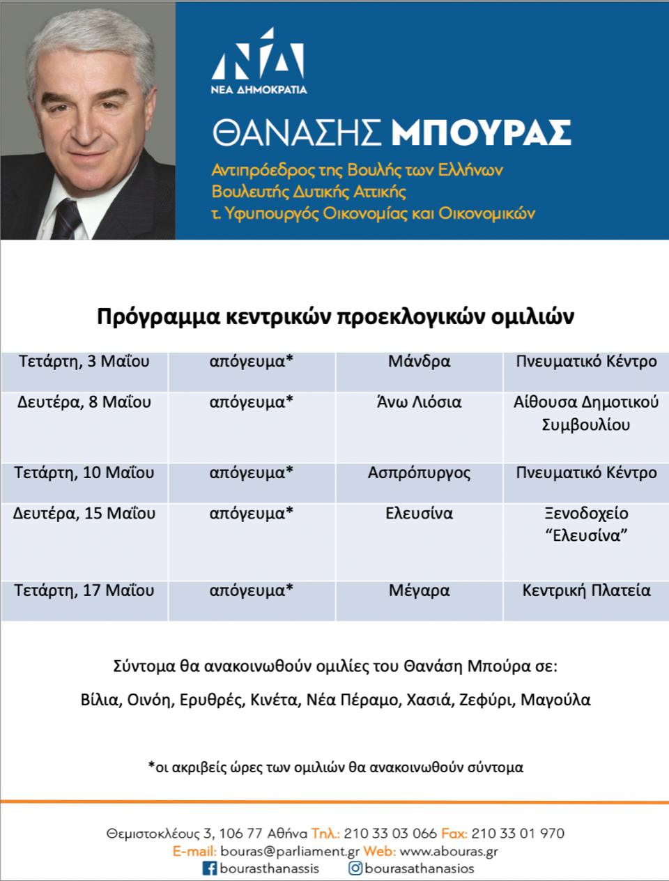 ΠΟΛΙΤΙΚΗ Οι ημερομηνίες των κεντρικών ομιλιών του Θανάση Μπούρα Ημερομηνία: 8 Απριλίου 2023 Κοινοποιήση: FacebookPinterestWhatsApp Προηγούμενο άρθροΈκπληξη στη Φυλή τα “Λαζαράκια” αναβίωσαν το έθιμο κι έψαλλαν τα κάλανταΕπόμενο άρθροΆστατος ο καιρός ως και τη Μ. Τετάρτη Τέσσερις τελευταίες «Καραμέλες Ούζου» στο Από Μηχανής Θέατρο 16 Απριλίου 2026 Ολοκλήρωση σύνταξης Επιχειρησιακού Σχεδίου για την εξασφάλιση κοινοχρήστων και κοινωφελών χώρων στον Δήμο Φυλής ΑΥΤΟΔΙΟΙΚΗΣΗ Νεφελώδης καιρός με μικρή πιθανότητα για ασθενείς τοπικές βροχές αύριο Κυριακή του Πάσχα – Πρόγνωση καιρού Άνω Λιοσίων, Φυλής & ν.Αττικής ΚΑΙΡΟΣ Καλό Πάσχα, χρόνια πολλά! – Cityface.gr ΠΟΛΙΤΙΣΜΟΣ Ισχυρό επενδυτικό ενδιαφέρον για την ανέγερση φοιτητικών εστιών 1.100 κλινών στο Πανεπιστήμιο Δυτικής Αττικής, μέσω ΣΔΙΤ ΚΟΙΝΩΝΙΑ Πλήθος πιστών στην Περιφορά του Επιταφίου των Αγίων Κων/νου και Ελένης στα Άνω Λιόσια ΕΚΚΛΗΣΙΑ παρομοια αρθρα ΠΟΛΙΤΙΚΗ “Έξω η Ελλάδα από τον πόλεμο” – Εκδήλωση κομματικών οργανώσεων Δήμου Φυλής του ΚΚΕ ΠΟΛΙΤΙΚΗ Προσυνεδριακός διάλογος ΠΑΣΟΚ στα Άνω Λιόσια Η Ν.Ο.Ε.Σ. Δυτικής Αττικής και η Τοπική Οργάνωση Φυλής ΠΑΣΟΚ – Κίνημα Αλλαγής διοργανώνουν εκδήλωση προσυνεδριακού διαλόγου με... ΠΟΛΙΤΙΚΗ Ημερίδα με θέμα “Γονεϊκή αγκαλιά ως θεμέλιο της ψυχικής ανθεκτικότητας” από τον σύλλογο Γονέων & Κηδεμόνων του δημοτικού σχολείου Φυλής το Σάββατο 31/1 ΠΟΛΙΤΙΚΗ Ευάγγελος Λιάκος: «Ο Προϋπολογισμός 2026 επιστρέφει μετρήσιμα την ανάπτυξη στην κοινωνία» Στην Ολομέλεια της Βουλής τοποθετήθηκε ο Βουλευτής Δυτικής Αττικής της Νέας Δημοκρατίας, Ευάγγελος Λιάκος, κατά τη συζήτηση για...