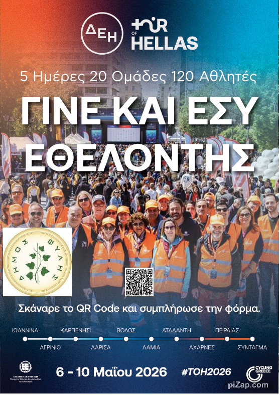 Για πρώτη φορά, ο ποδηλατικός γύρος ΔΕΗ Τours θα περάσει μέσα από τον Δήμο Φυλής. Ειδικότερα, το Σάββατο 9 Μαϊου 20206 το μεσημέρι θα περάσει μέσα από τους δρόμους της Χασιάς και των Άνω Λιοσίων. Θέλεις να ζήσεις από κοντά τη μοναδική εμπειρία ενός κορυφαίου αθλητικού γεγονότος; Γίνε εθελοντής στον ΔΕΗ Tour of Hellas 2026 και βοήθησε να γίνει πραγματικότητα μια διοργάνωση γεμάτη πάθος, δυναμισμό και έμπνευση! Γίνε Οικοδεσπότης/Οικοδέσποινα της διοργάνωσης και κάνε τον αγώνα μια ξεχωριστή παγκόσμια εμπειρία για τους συμμετέχοντες.