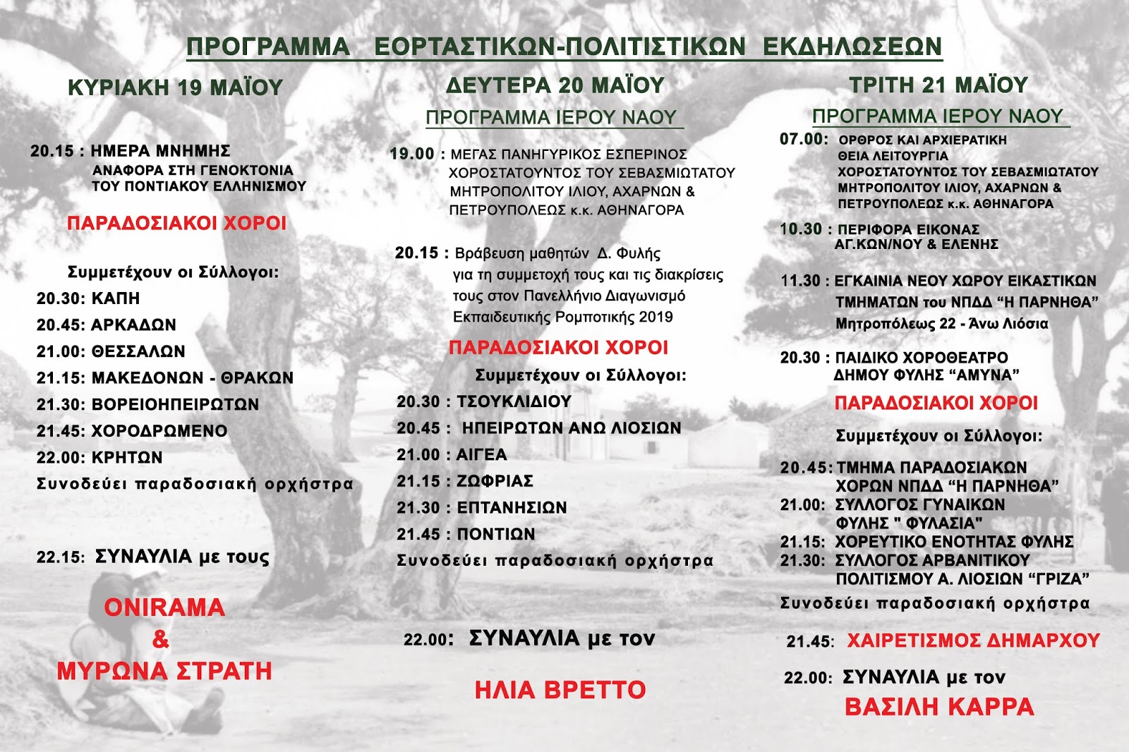 ΧΑΣΙΑ Διαβάστε – Το πρόγραμμα του πανηγυριού των Άνω Λιοσίων Ημερομηνία: 22 Μαρτίου 2022 Κοινοποιήση: FacebookPinterestWhatsApp Το πρόγραμμα του πανηγυριού των Άνω Λιοσίων Προηγούμενο άρθροΣτην τελική της ευθεία η «μάχη» των εκλογών στο Δήμο ΦυλήςΕπόμενο άρθροΈνταση και… ξύλο σε κομματική διαδήλωση την Κυριακή στα Άνω Λιόσια Στήριξη στα ΑμΕΑ, τους φοιτητές και τους άνεργους μέσω του Αθλητισμού από τον Δήμο Φυλής 10 Οκτωβρίου 2025 «Αισθητά βελτιωμένη η κατάσταση στα μέσα μαζικής μεταφοράς σε Άνω Λιόσια, Μενίδι και Ζεφύρι», λέει η ΕΛ.ΑΣ. ΚΑΘΗΜΕΡΙΝΟΤΗΤΑ Επανήλθε στο κανονικό δρομολόγιο το λεωφορείο 735 (ΑΧΑΡΝΕΣ-ΖΕΦΥΡΙ-ΣΤ. ΚΑΤΩ ΠΑΤΗΣΙΩΝ) ΚΑΘΗΜΕΡΙΝΟΤΗΤΑ Την Κυριακή 12/10 ο 12ος Ποδηλατικός Γύρος της Ζωφριάς ΤΟ ΒΗΜΑ ΤΩΝ ΣΥΛΛΟΓΩΝ Τρία σημαντικά έργα ανάπλασης σε Άνω Λιόσια και Ζωφριά με χρηματοδότηση της Περιφέρειας Αττικής – 23,9 εκατ. ευρώ ο συνολικός προϋπολογισμός ΔΗΜΟΣ ΦΥΛΗΣ Παροχή υπηρεσιών υποστήριξης ευάλωτων οφειλετών και δημοτών ευπαθών ομάδων σε θέματα πλειστηριασμών πρώτης κατοικίας ΑΥΤΟΔΙΟΙΚΗΣΗ παρομοια αρθρα ΠΟΛΙΤΙΣΜΟΣ Συγκίνηση στο μνημόσυνο για τους 18 εκτελεσθέντες στη Φυλή το 1944 Με μία λιτή εκδήλωση τιμής και μνήμης ο Δήμος Φυλής συνέχισε και φέτος να κρατάει άσβεστη τη φλόγα... ΚΑΘΗΜΕΡΙΝΟΤΗΤΑ Βίντεο-σοκ από το ατύχημα στη Φυλή – Έκκληση για αίμα για τη νεαρή Σταυρούλα που τραυματίστηκε βαρύτατα (video) Γροθιά στο στομάχι συνιστούν οι λεπτομέρειες, αλλά και τα βίντεο που βλέπουν το φως της δημοσιότητας μετά το... ΚΑΘΗΜΕΡΙΝΟΤΗΤΑ Πώς έγινε το τροχαίο με το νεκρό 15χρονο στη Φυλή – Κάτοικος έσωσε την κοπέλα που έχασε το πόδι της Ο θάνατος του ανήλικου που καθόταν στο πίσω κάθισμα ήταν ακαριαίος - Ένα ακόμη άτομο χαροπαλεύει στο νοσοκομείο... ΚΑΘΗΜΕΡΙΝΟΤΗΤΑ Δείτε – Το ρεπορτάζ της ΕΡΤ για το τραγικό δυστύχημα στη Φυλή (video) Σοκ έχει προκαλέσει το τραγικό τροχαίο δυστύχημα που συνέβη το πρωί στη Φυλή (στην οδό Ιάσμου στο δρόμο...